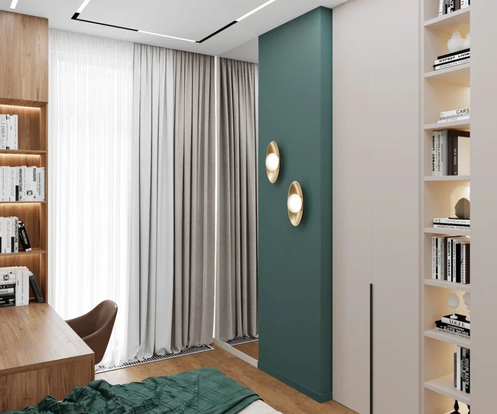 В детских комнатах поддерживается общая стилистика и цветовая гамма квартиры. Одна комната более тематическая за счет настенной фрески с растительным рисунком в изумрудном глубоком цвете. Вторая комната же более строгая и выполнена в более светлых оттенках, что немного отражает характеры будущих жильцов.