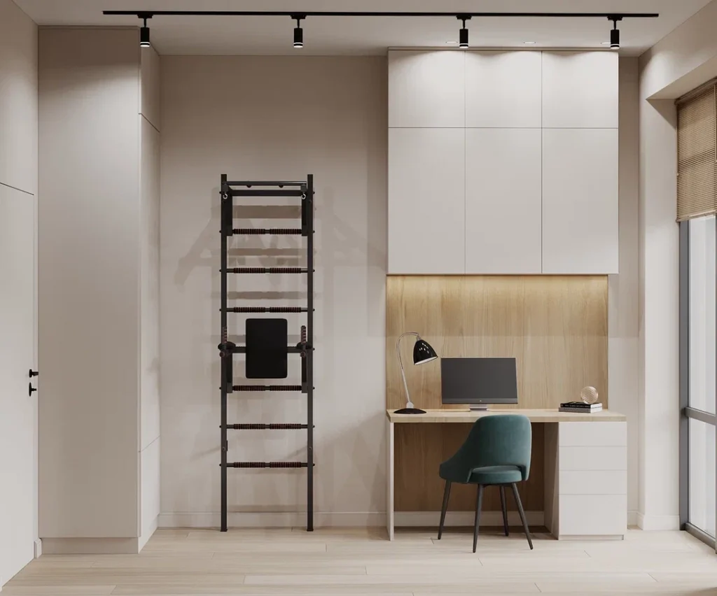 В кабинете отделка стен и мебели не отличается от интерьера всей квартиры, а текстиль подобран яркий. Такой интерьер легко переделать в будущем под пространство для ребенка.