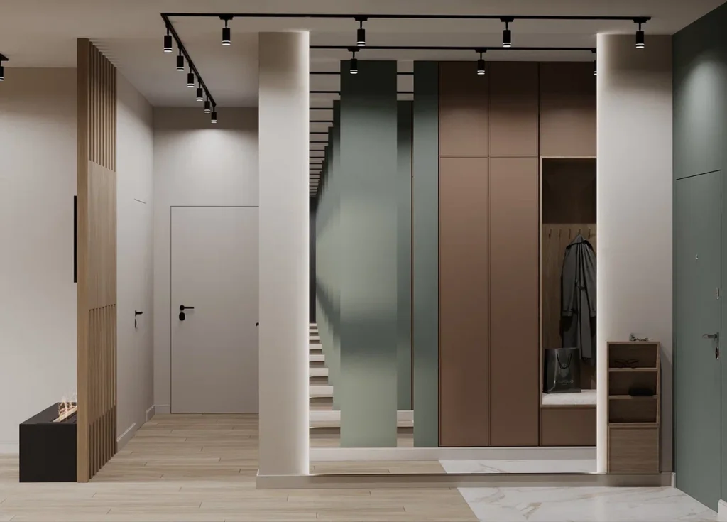 За основу интерьера взят холодный бежевый цвет стен, который разбавлен деревянными фасадами, стеновыми панелями, сдержанными оттенками зеленого и терракотового цветов. Для напольного покрытия в комнатах выбрали пробку, а в прихожей и санузлах керамогранит. Межкомнатные двери скрытого монтажа и под покраску в цвет стен. Фурнитура светильников, дверные ручки и выключатели с розетками в черном цвете. Главной задачей было создать гармоничное пространство для отдыха и жизни, комфортное и функциональное жилье. Кабинет спроектировать так, чтобы в будущем его легко можно было трансформировать в детскую комнату. На выходе очень удобно смотреть в зеркальную стену с подсветкой, поэтому входная зона оформлена зеркалами, которые расположены друг напротив друга и вызывают эффект рекурсии. В нише располагается встроенный шкаф с открытыми крючками и мягким сидением. Прихожая, коридор и кухня-гостиная спланированы в едином пространстве, которое лишь зонировано визуальными приемами. Преимущество открытого пространства в просторе и освещенности естественным светом. Зона прихожей и коридора освещаются светильниками на магнитном шинопроводе, расположенным в одну линию, который за одно и отделяет входную зону от кухни-гостиной.
