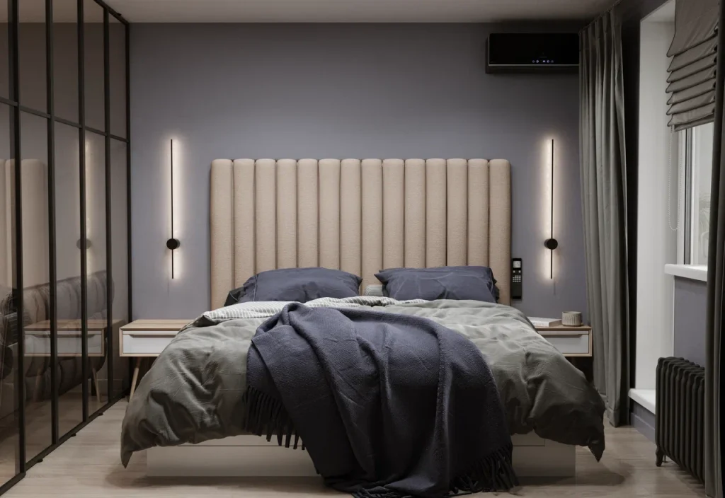 Жилую комнату решили разделить специальной стеклянной перегородкой. Таким образом, получилось два полноценных помещения с разными назначениями: спальня и кабинет-гостиная. Кабинет довольно ламповый и спокойный, с четкими линиями. В такой атмосфере проще настроиться и на расслабление, и на рабочее настроение. Спальня в этом не отстает, огромная мягкая кровать с большим изголовьем занимает почти все пространство. Стильные бра по бокам испускают теплый мягкий свет, и с каждой стороны есть прикроватная тумба. Для уюта добавлены классические шторы от потолка.