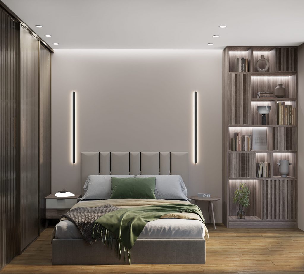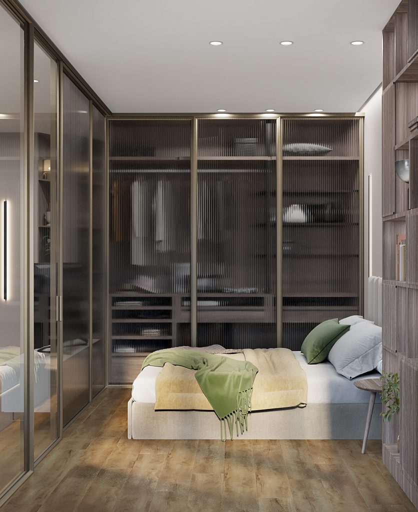 Спальня оформлена в спокойных тонах, обеспечивая уют и релаксацию после насыщенного дня. Высокое мягкое изголовье кровати становится центральным элементом комнаты, добавляя комфорта и стиля. Эргономичное освещение у изголовья создаёт мягкий акцентный свет, способствующий расслаблению. Зона хранения включает шкафы с рифлеными стеклянными фасадами, которые добавляют глубину и текстуру интерьеру, сохраняя при этом ощущение лёгкости. Многофункциональная книжная полка с интегрированной подсветкой предлагает удобное место для книг и декоративных элементов, подчеркивая индивидуальность пространства.