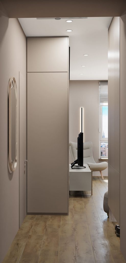 Однокомнатная квартира с перепланировкой в двухкомнатную, в современном стиле в бежевых оттенках; с прихожей, гостиной, мини-кухней, спальней и санузлом.