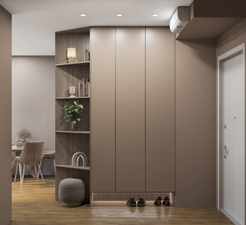 Прихожая стала первым акцентным пространством, задающим тон всему интерьеру. Мы учли пожелания заказчицы о рациональном использовании пространства и организовали высокие встроенные шкафы с гладкими фасадами без ручек, что создает ощущение чистоты и порядка. Открытые полки с декоративными элементами добавляют уют и индивидуальность, предоставляя место для ключей, растений и стильных аксессуаров. Мягкий пуф обеспечивает комфорт при переобувании, а скрытая подсветка под пола подчеркивает отделку и визуально увеличивает высоту помещения.