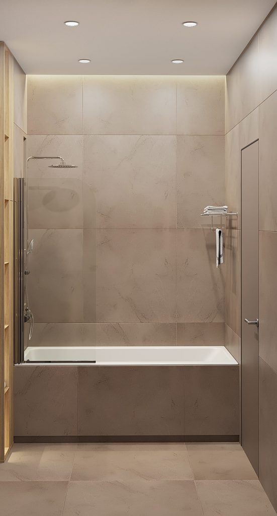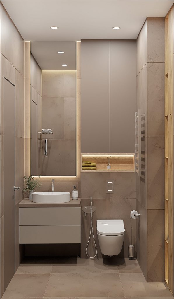 Просторная ванная комната сочетает в себе функциональность и стиль. Ниша с подсветкой обеспечивает удобное хранение косметики и аксессуаров, поддерживая порядок и добавляя современный акцент. Подвесная тумба с интегрированной раковиной оптимизирует использование пространства, освобождая пол для удобного перемещения. Отделка стен и пола керамогранитом с текстурой камня не только эстетически привлекательна, но и практична, устойчива к влаге и простая в уходе. Современная ванна с прозрачной стеклянной перегородкой добавляет изысканности и защищает пространство от брызг, сохраняя визуальную лёгкость интерьера. Зеркало с подсветкой завершает образ, обеспечивая функциональность и стильный вид.