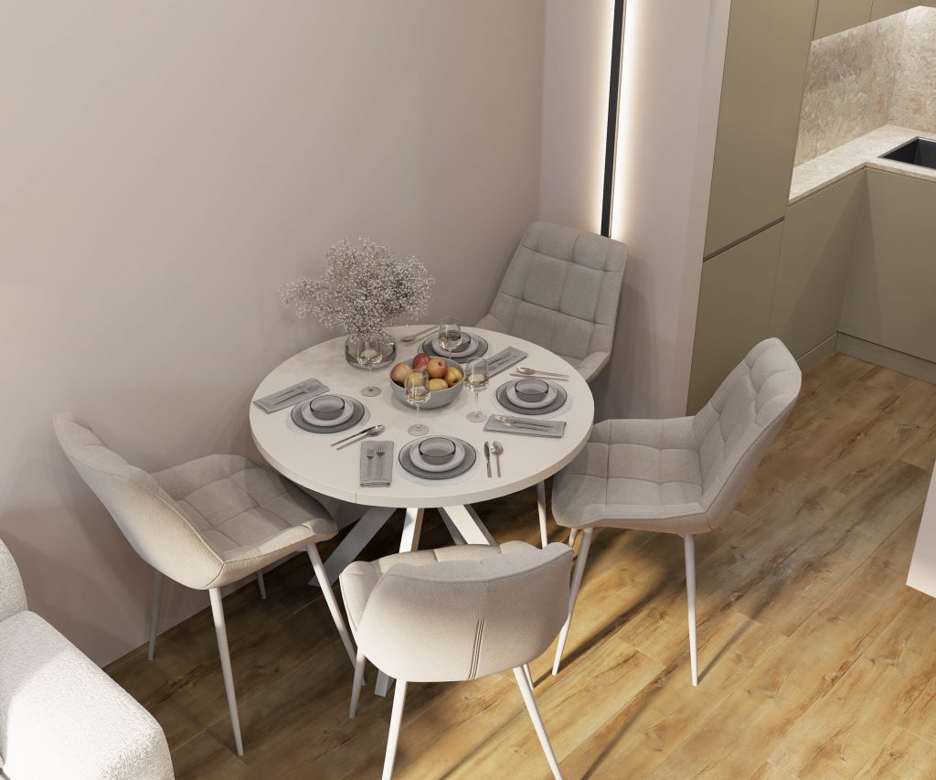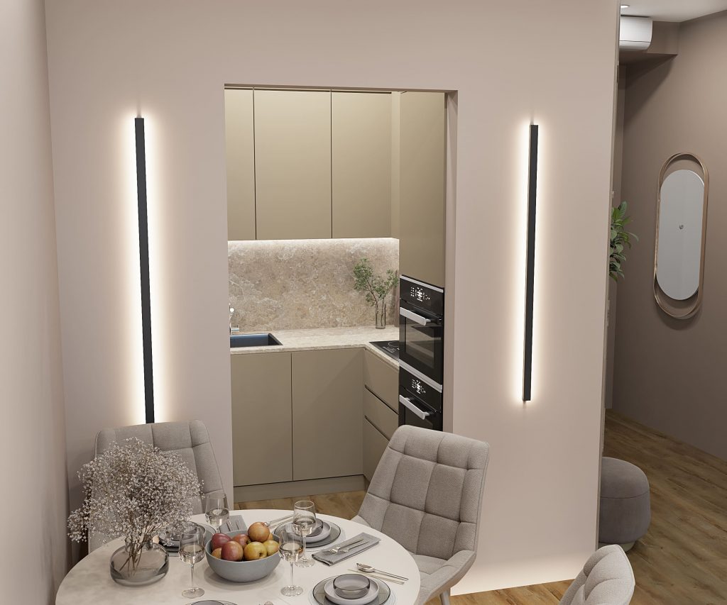 Кухня-гостиная выполнена в стиле, сочетающем минимализм и современные тенденции. Кухонная ниша скрывает все необходимое оборудование, сохраняя чистоту линий и аккуратность пространства. Интегрированная техника и высокие шкафы обеспечивают эргономичное использование пространства, а фартук из натурального камня добавляет роскоши и изысканности. Обеденная зона с мягкими стульями и аккуратно расположенным столом создает идеальное место для семейных ужинов и встреч с друзьями.