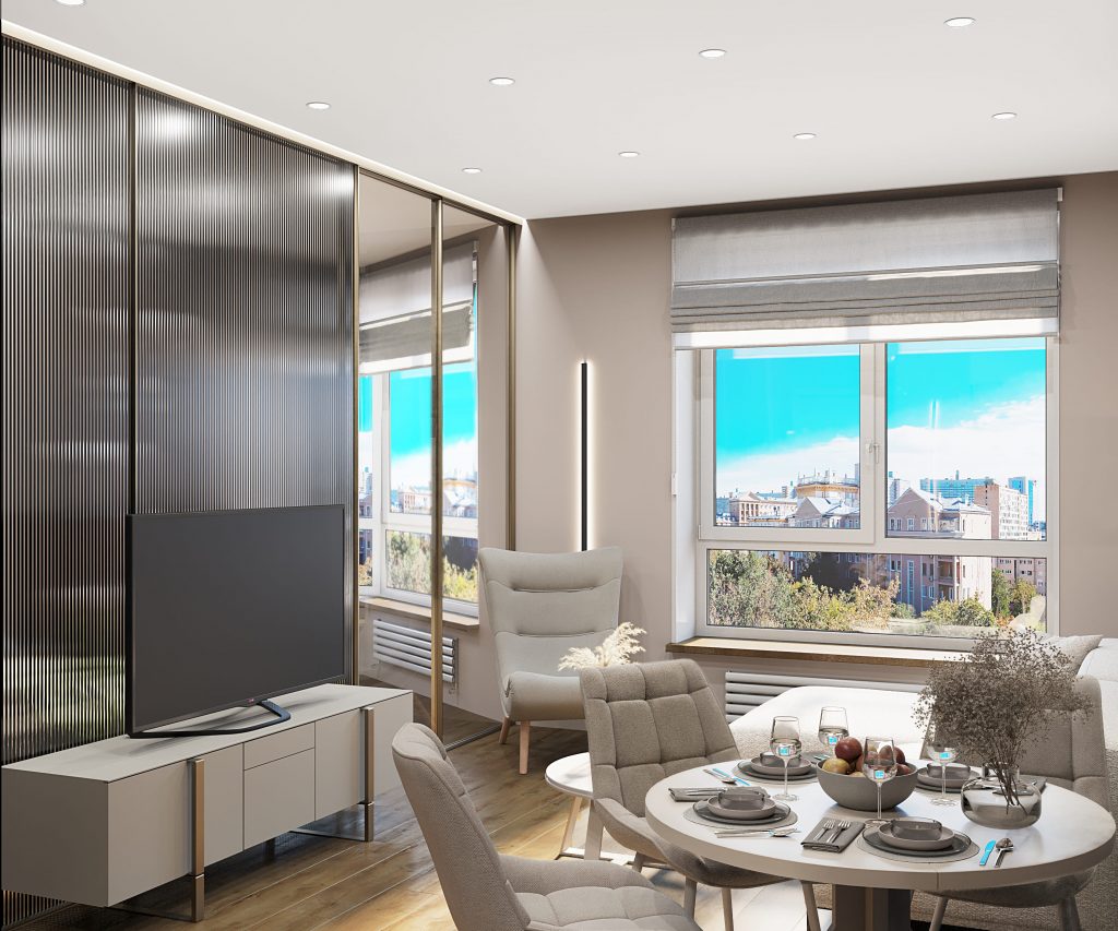 Учитывая предпочтения заказчицы, которая ценит атмосферу гостеприимства и регулярно принимает гостей, мы разработали открытую планировку с четким зонированием. Стеклянная перегородка позволяет сохранять объем пространства, обеспечивая возможность трансформации помещения из открытой зоны для гостей в отдельную спальню. Оставленные открытыми окна с римскими шторами минимально забирают пространство и позволяют максимально использовать естественное освещение. Большой подоконник служит стильным и функциональным элементом, создавая уютную зону отдыха.