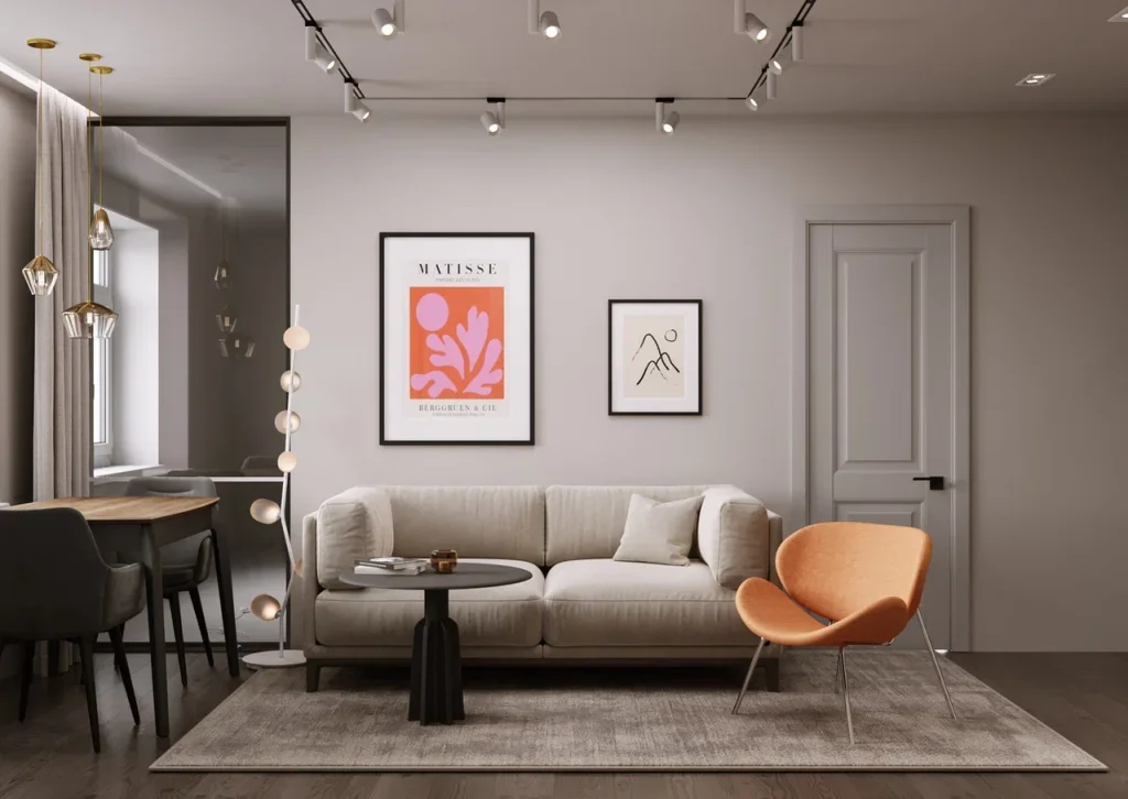 Двухкомнатная квартира для молодого мужчины в современном стиле с добавлением ярких элементов, с гостиной, кухней, спальней и санузлом.
