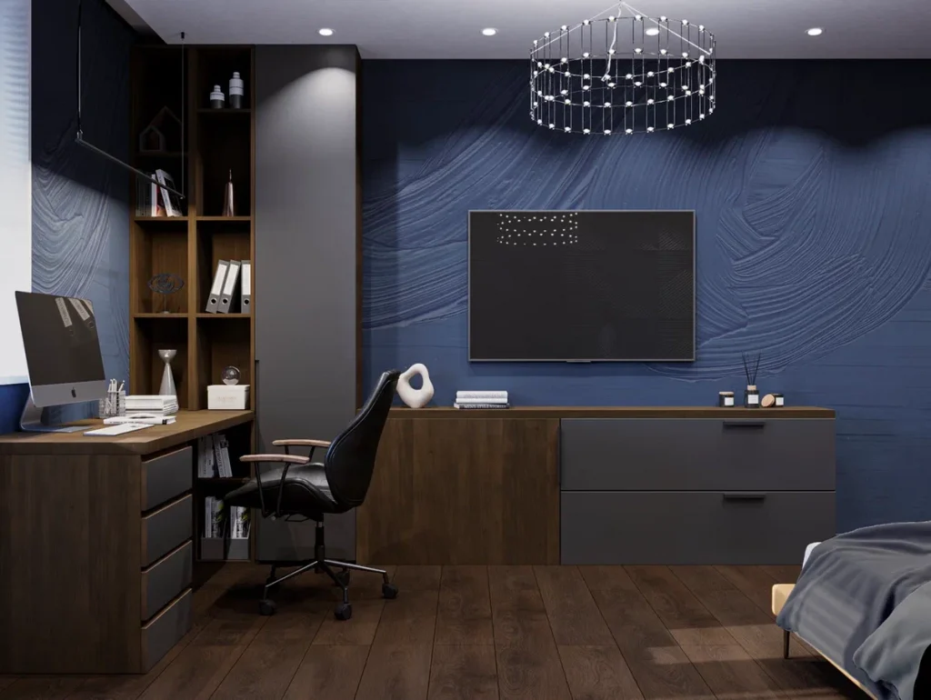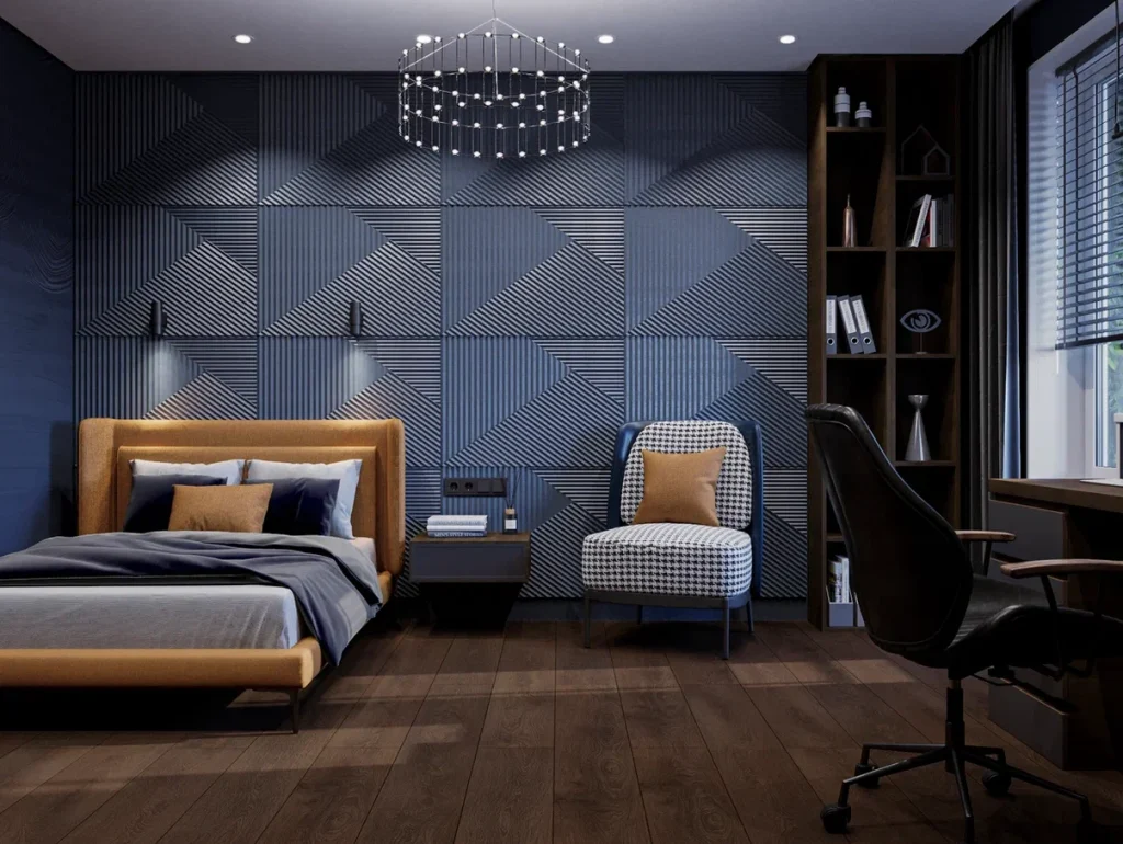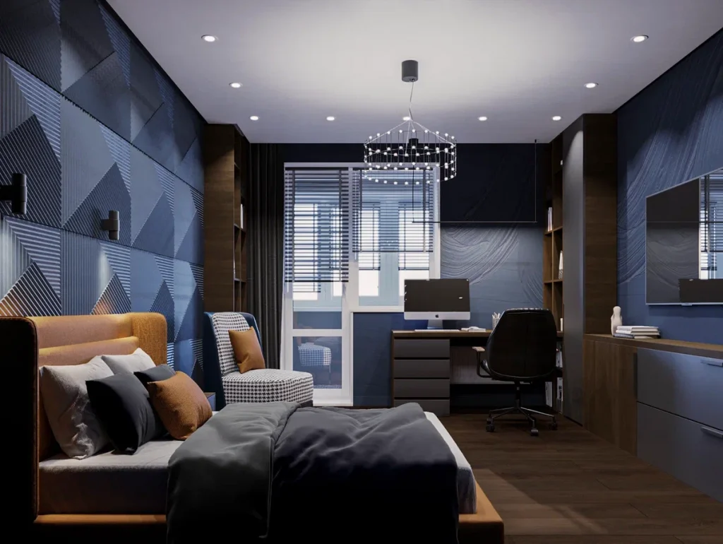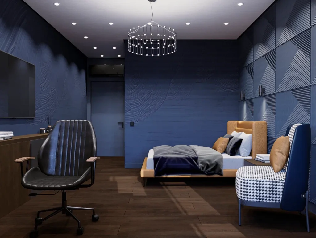 Комната сына-подростка получилась брутальной и творческой одновременно. Для данной спальни подобраны темные оттенки синего и дерева, но яркий горчичный цвет кровати их оттеняет. Не смотря на однотонность синего цвета стен, там применены необычные фактуры. За кроватью за счет 3d панелей удалось добиться повторяющейся геометричной фактуры, а на других стенах за счет декоративной штукатурки геометричность разбавили плавными линиями крупными мазками. Комната оснащена большим количеством мест хранения для книг и личных вещей, удобной рабочей зоной у окна, TV и спальной зоной. В комнате также имеется индивидуальный вход в гардеробную.
