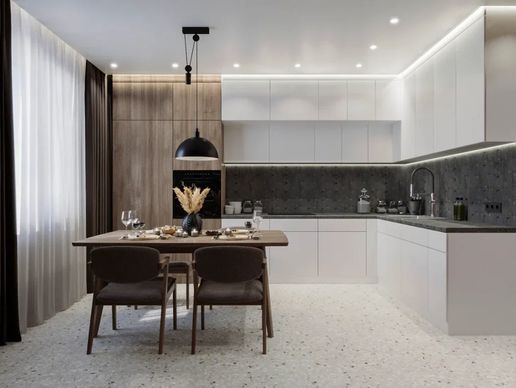 В просторной кухне для фона взяты те же цвета, что и в прихожей-коридоре, в кухонной мебели добавлена текстура дерева и графитового цвета камня. Зона TV поместилась в конструкции из гипсокартона с деревянными нишами-полками для книг и выкрашена в тон стен. По центру расположился большой обеденный стол с подвесным светильником над ним.