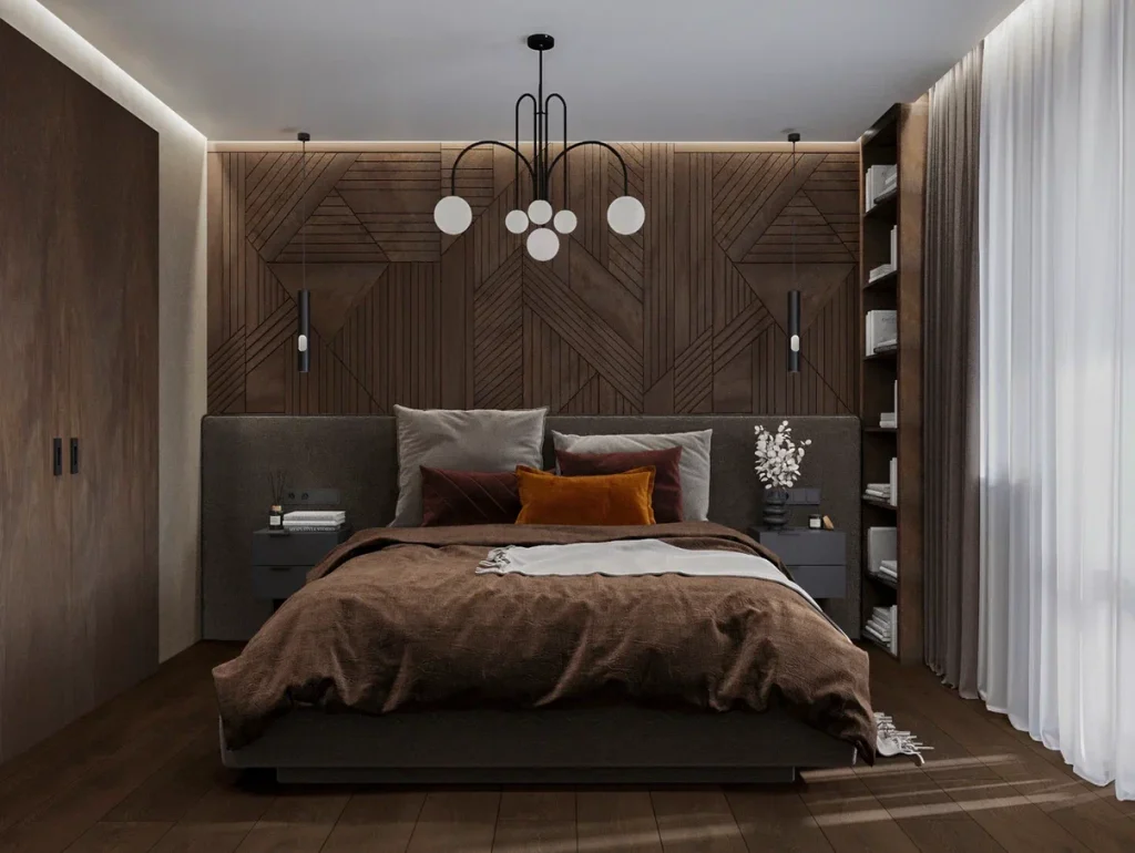 Здесь в отделке стен присутствует больше дерева, которое оттенено светло-серым цветом. Дерево создает здесь особое ощущение уюта и тепла, оно обволакивает. Панели за кроватью выложены геометрическим узором, внизу переходя в мягкую панель, которая играет роль спинки кровати. Большие деревянные двери ведут в индивидуальную гардеробную комнату.