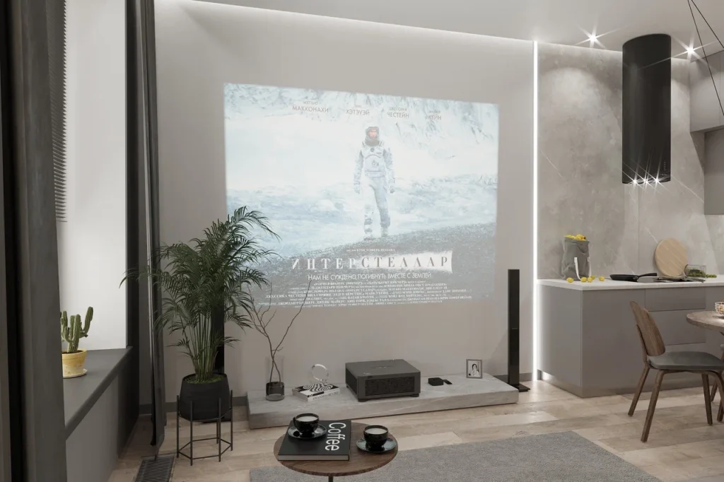 Отлично зонированная кухня-гостиная включает в себя угловую кухню, обеденную группу с круглым столом, зону отдыха с проектором и мягким диваном. В кухонной зоне обращает на себя внимание островная цилиндрическая вытяжка черного цвета, она совсем не похожа на вытяжку с первого взгляда, смотрится очень легко и современно. Обеденный стол удачно обыгран декоративным подвесным светильником. Кухонная мебель смонтирована в потолок – по канонам современного стиля. Линейный светильник в стене визуально очерчивает зону кухни от гостиной. За диваном интересным решением было сделать геометрические стеновые панели с подсветкой и сочетать его с лаконичным современным бра.