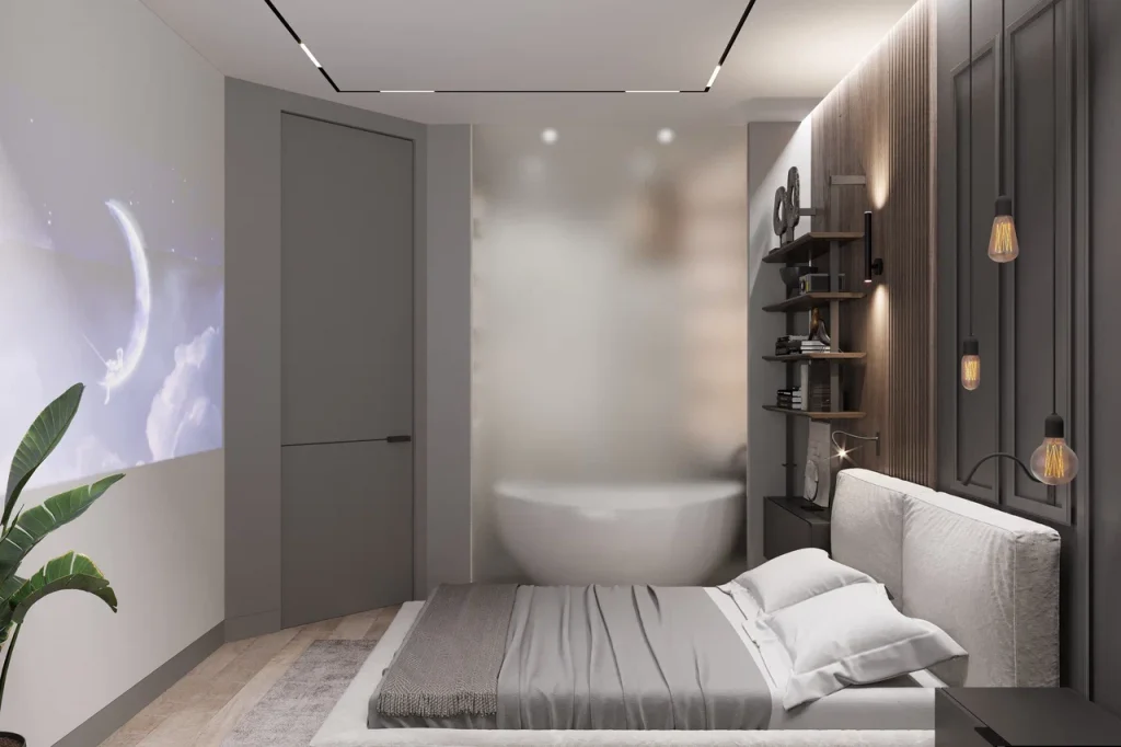 В спальне также использовали проектор вместо телевизора. Самое интересное решение – это стеклянная стена с ванной. Это и дополнительно расширяет пространство и добавляет изюминку в интерьер спальни, так как вид на роскошную ванную из нее ничуть не портит общий облик интерьера. Центром спальни является мягкая двуспальная кровать в стиле лофт. За кроватью использовались комбинированные декоративные стеновые панели. Здесь также большое разнообразие сценариев освещения: подвесы, встроенные подсветки в потолке, бра, гибкий бра у кровати, верхний свет.