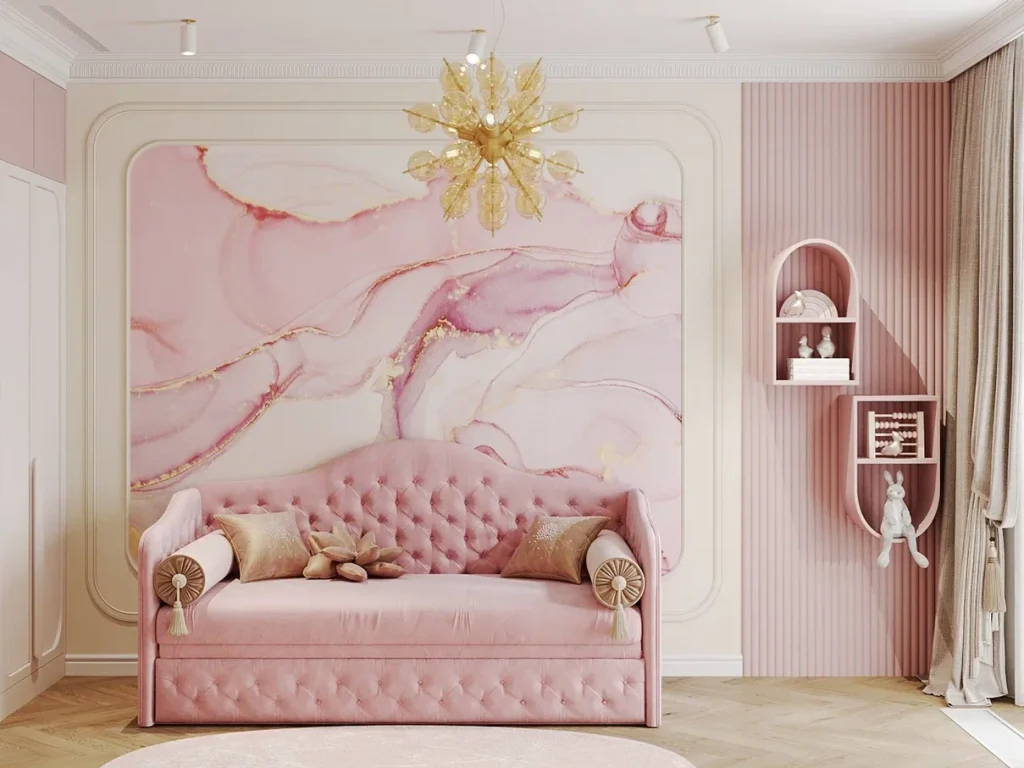 Интерьер детской комнаты выполнен в традиционном розовом цвете для девочки. На стене в обрамлении изогнутых молдингов поместили фотообои с рисунком "флюид", который универсален для любого возраста и за счет золотых вкраплений идеально подходит под стилистику интерьера. В корпусной мебели продумано удобное хранение, рабочая зона и небольшая скамейка с мягкой стеной. Детская кровать быстро и легко трансформируется в красивый диван.