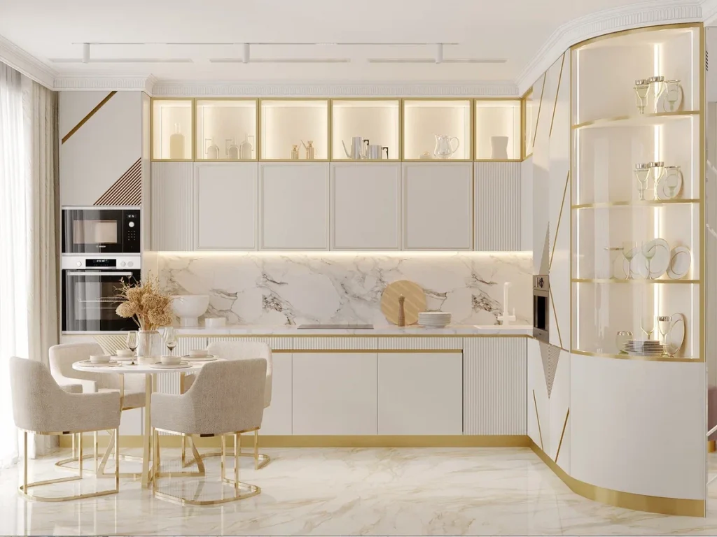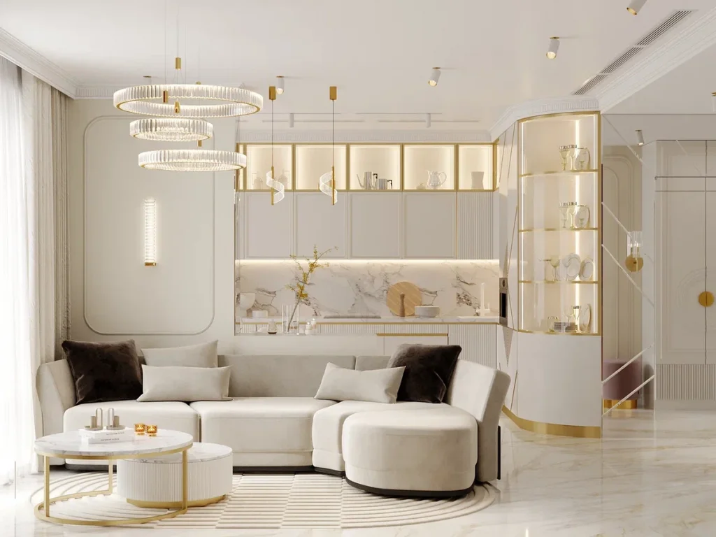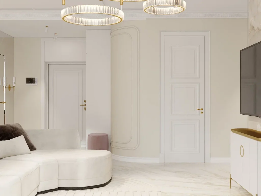 Цветовая гамма спокойная, нейтральная с использованием натуральных оттенков камня и дерева. Элементы освещения и металлическая фурнитура выполнены в золотом цвете. В геометрии интерьера присутствуют изысканные радиусные формы, что придает интерьеру изюминку и мягкость. В отделке задействовано много зеркальных и стеклянных поверхностей, лепнины и багетов, а за основу взята покраска стен. Предусмотрено локальное и заполняющее освещение посредством очень красивых подвесных светильников, бра и точечных поворотных, а также большого количества подсветки в мебели.
