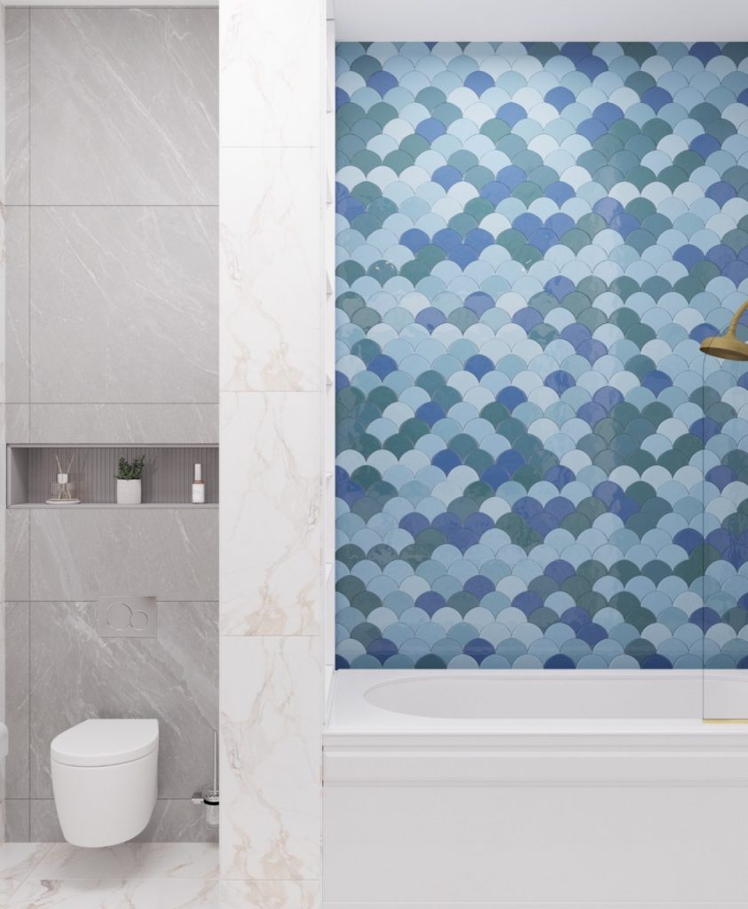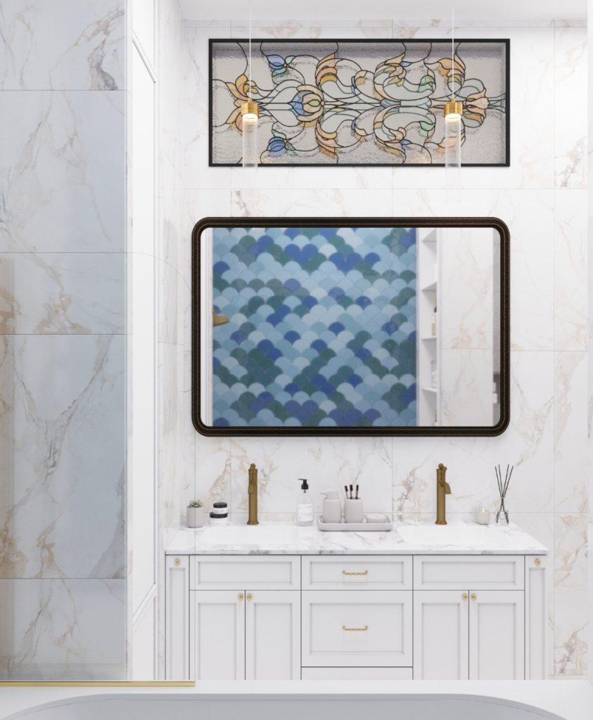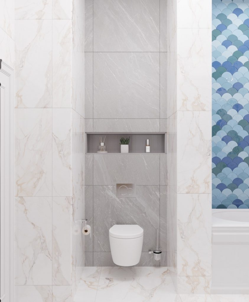 В санузле мы продолжили тему сочетания классики и современности. Акцентная стена с плиткой в форме чешуи в различных оттенках синего, выбранная по пожеланию супруга, добавляет яркий цветовой акцент и напоминает о морских путешествиях, которые семья обожает. Мраморная плитка на стенах и полу придаёт помещению элегантность и простор. Подвесной унитаз с системой инсталляции облегчает уборку и поддерживает минималистичный вид. Шкафчики под раковиной предоставляют место для хранения косметики и аксессуаров, сохраняя пространство организованным.