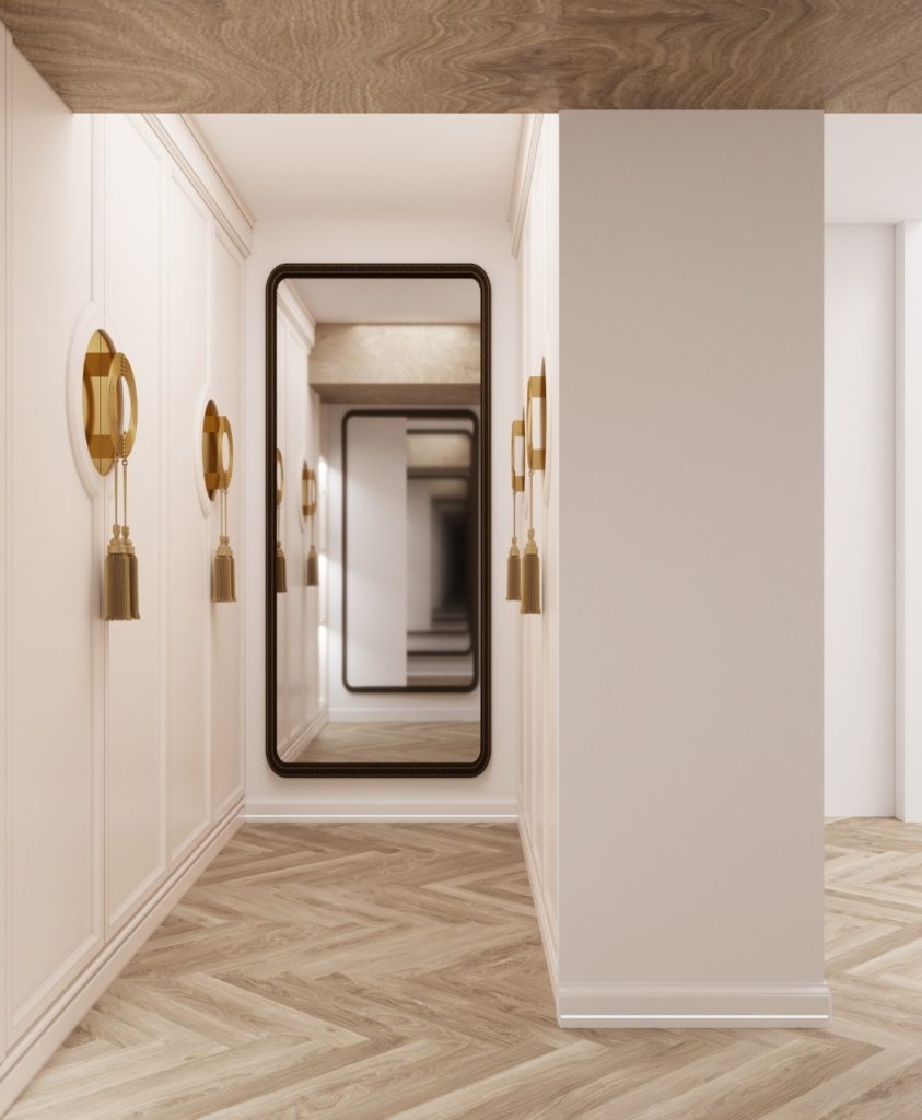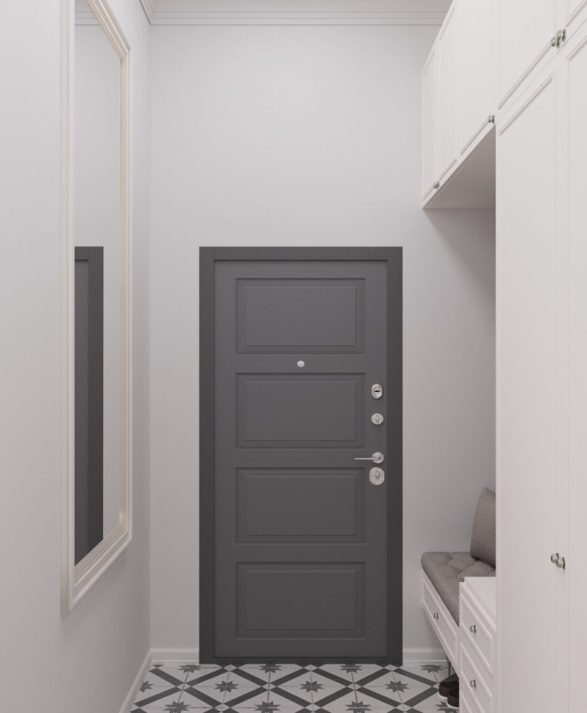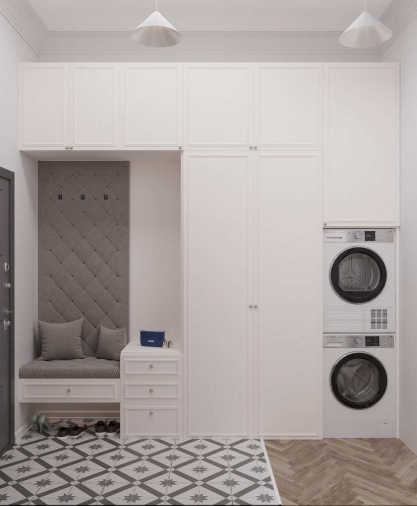 Молдинги вокруг большого зеркала визуально расширяют прихожую и позволяют удобно проверить внешний вид перед выходом. Встроенная скамья с мягкой обивкой и тумбой для хранения обуви обеспечивает комфорт и поддерживает порядок. Керамогранит с геометрическим узором на полу добавляет динамики и устойчив к износу — идеальное решение для активной пары.