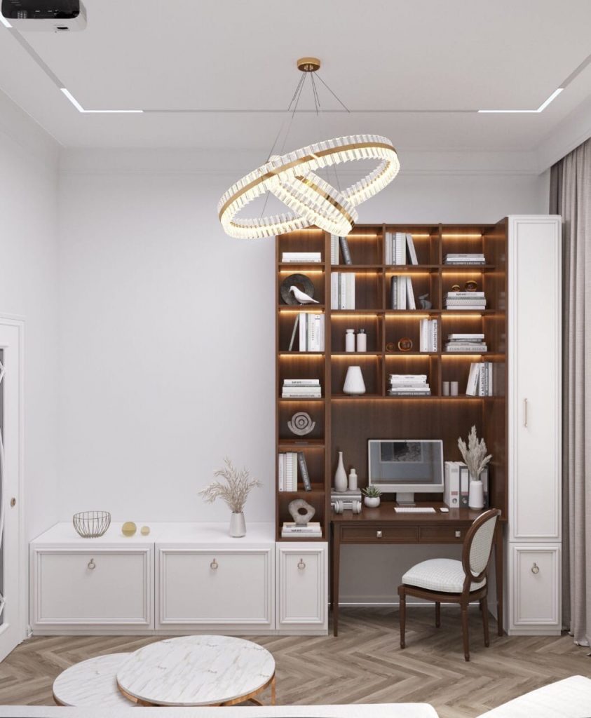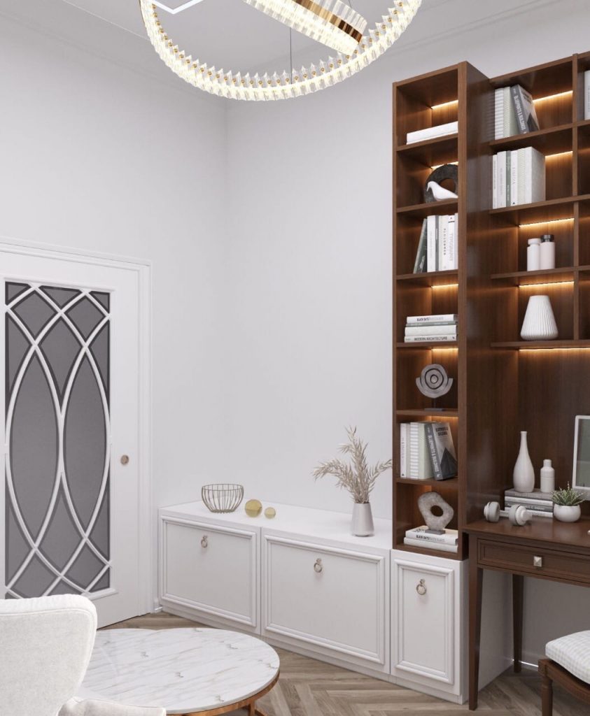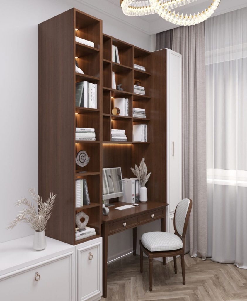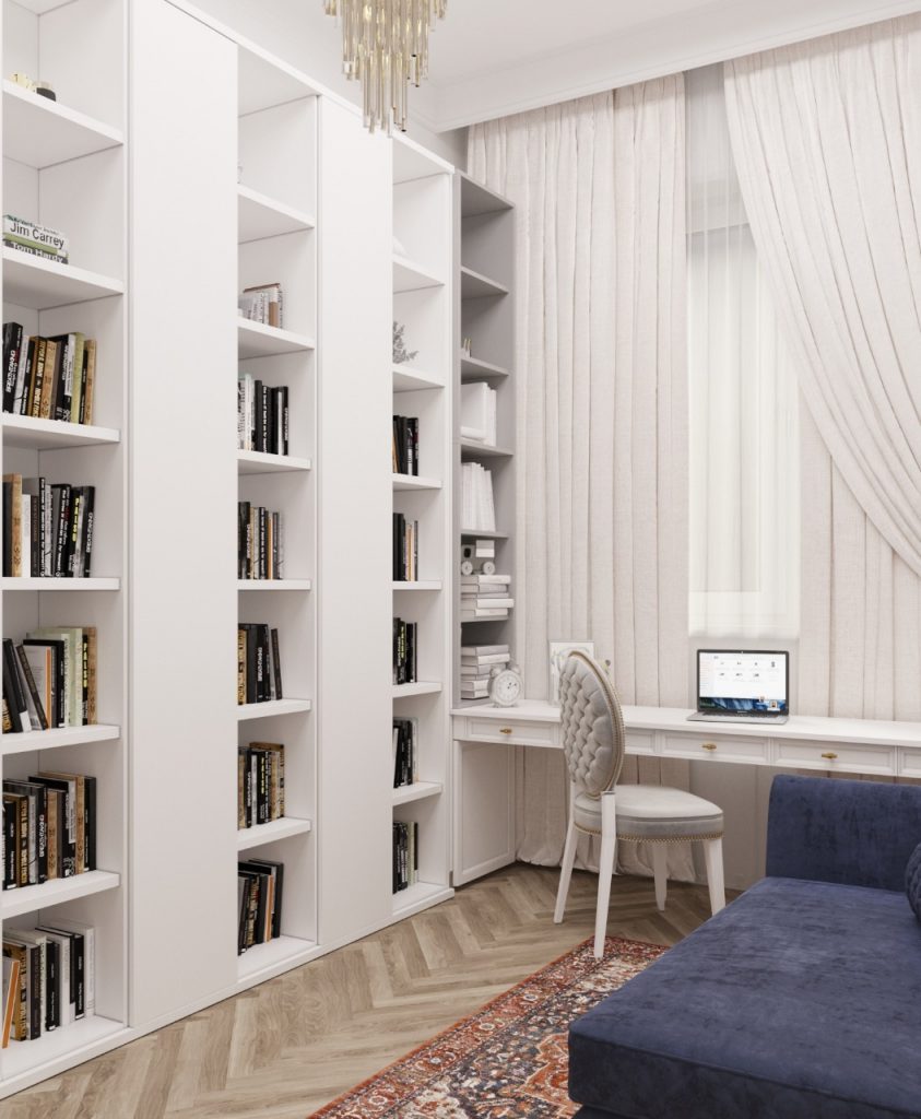Учитывая творческий образ жизни клиентов, команда Domeo объединила функции гостиной и кабинета в одном пространстве. Высокие стеллажи с подсветкой в тёмной отделке предоставляют место для коллекции книг и музыкальных инструментов. Декоративные панели с молдингами на стенах добавляют элегантность и глубину, соответствуя классическому стилю. Паркетная доска, уложенная ёлочкой, придаёт тепла и текстурного разнообразия.