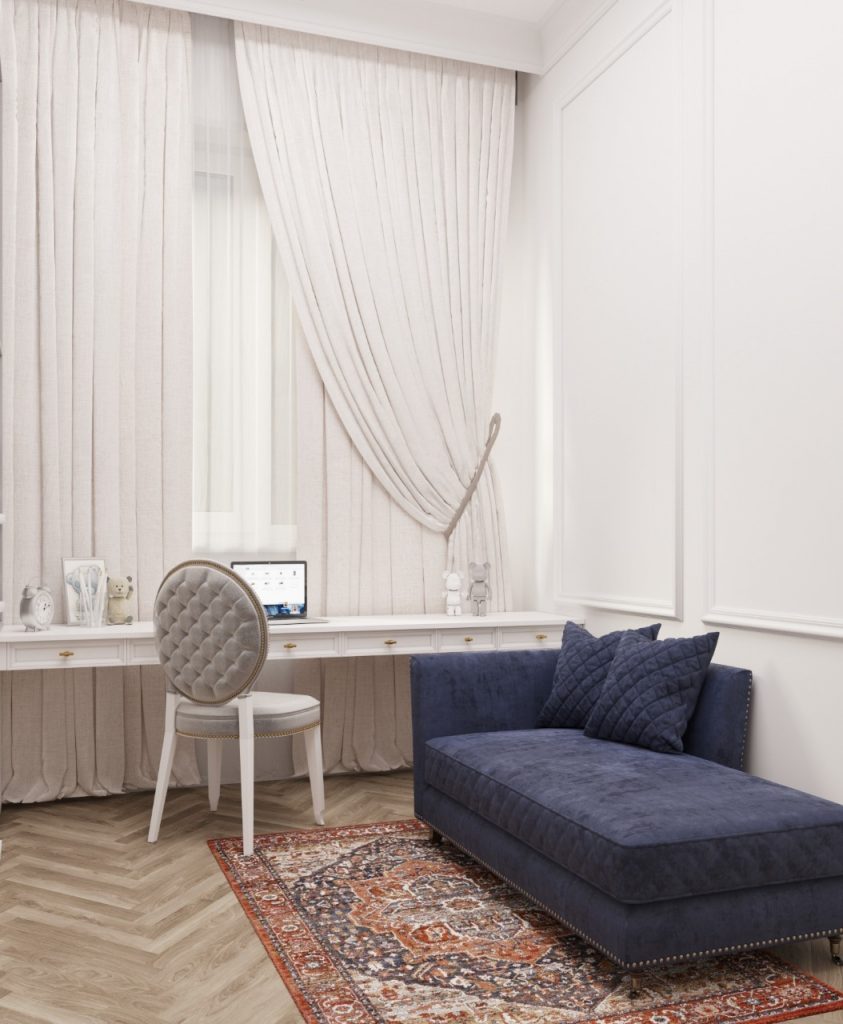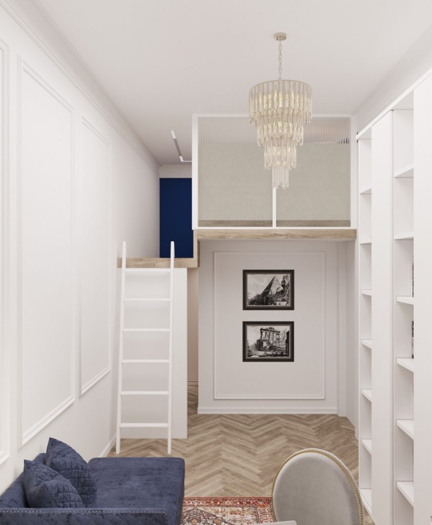 Создавая приватное пространство для отдыха и работы, архитекторы Domeo учли необходимость сочетания функциональности и эстетики. Мы разместили большую рабочую зону с нестандартно длинным столом, обеспечивающим место для комфортной работы. Встроенные открытые стеллажи позволяют хранить книги и личные вещи, поддерживая порядок. Уютная зона отдыха с мягким диваном и ковром с классическим узором создаёт атмосферу для расслабления. Подвесная кровать на антресоли — креативное решение, отражающее их любовь к нестандартным подходам. Под антресолью расположена гардеробная зона с большим зеркалом, отвечая их потребности в организованном хранении.