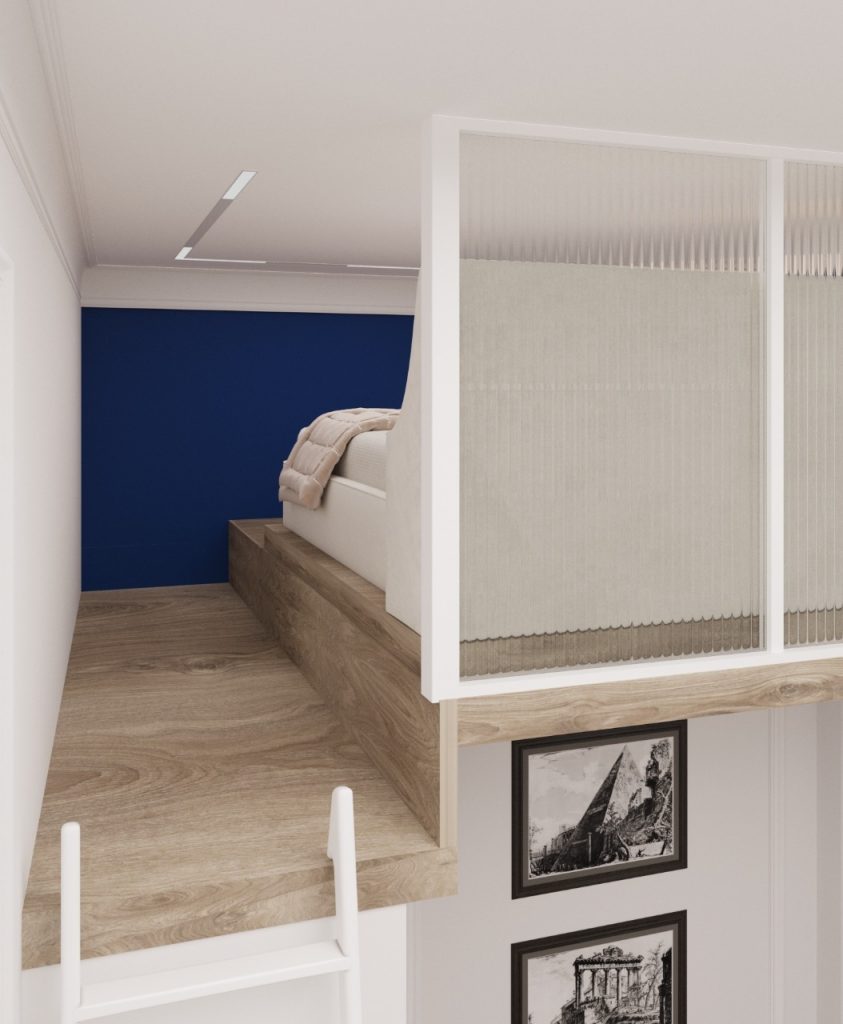 Также по просьбе супруги, мы интегрировали прожектор для просмотра фильмов, а раскладной диван с тёмно-синей обивкой обеспечивает дополнительное спальное место для гостей. Шкаф от пола до потолка визуально сливается со стеной, сохраняя лаконичность и функциональность пространства.