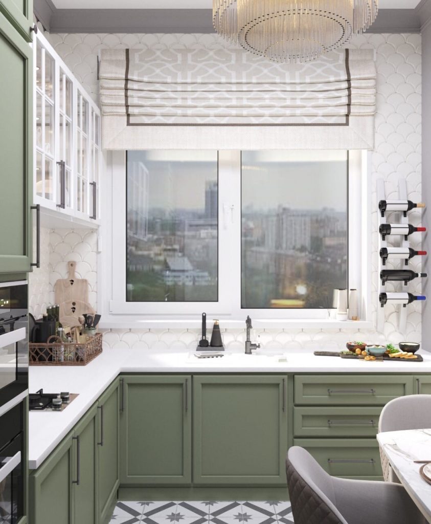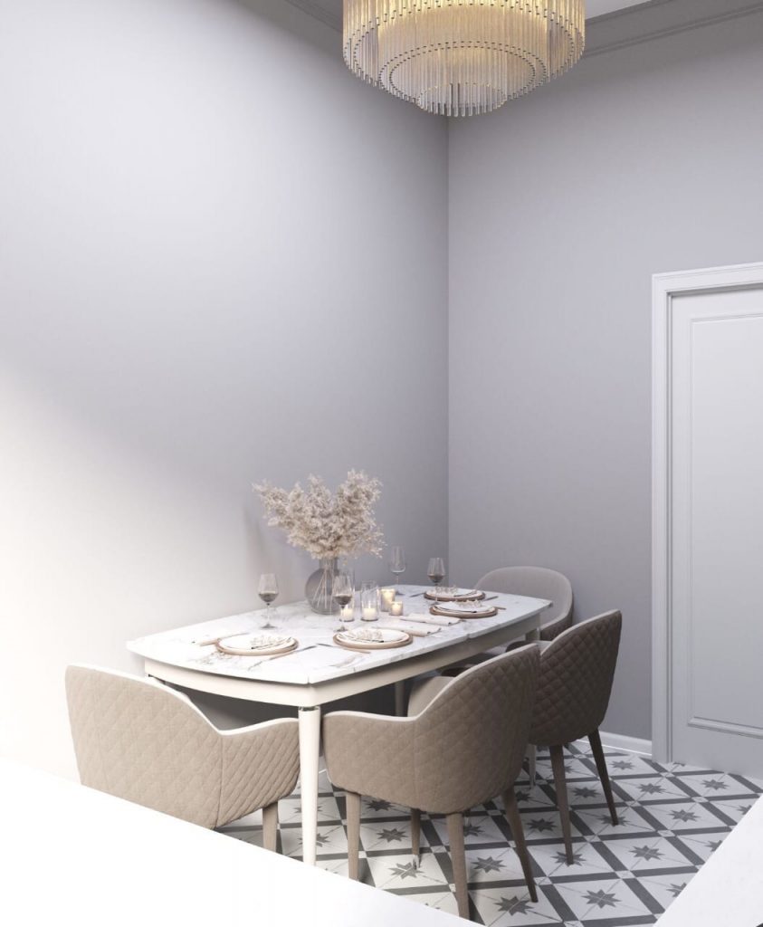 Плитка на фартуке в форме чешуи оживляет пространство, а шкафы со стеклянными вставками позволяют выставить любимую посуду. Подвесной кристальный светильник над обеденной зоной создаёт уютную атмосферу для романтических ужинов и дружеских встреч.