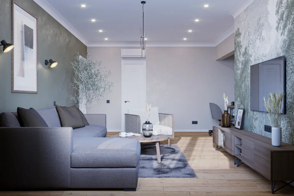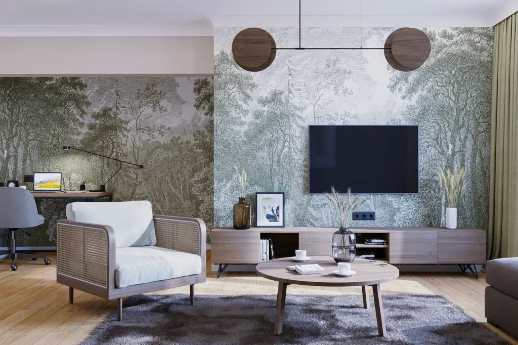 Уютную гостиную оформили в стиле оливкового сада, где листва имеет мятный и шалфеевый оттенок. Стены оформлены художественной фреской таинственного сада и декоративной штукатуркой. Оливковое дерево оживляет интерьер и задумку. Здесь разместили объёмную TV зону с угловым диваном и плетеным креслом, где можно расслабиться после напряженного дня или провести время в компании гостей. Дизайнерский деревянный подвесной светильник отлично вписался здесь. Так же в гостиной уместилось просторное рабочее место.
