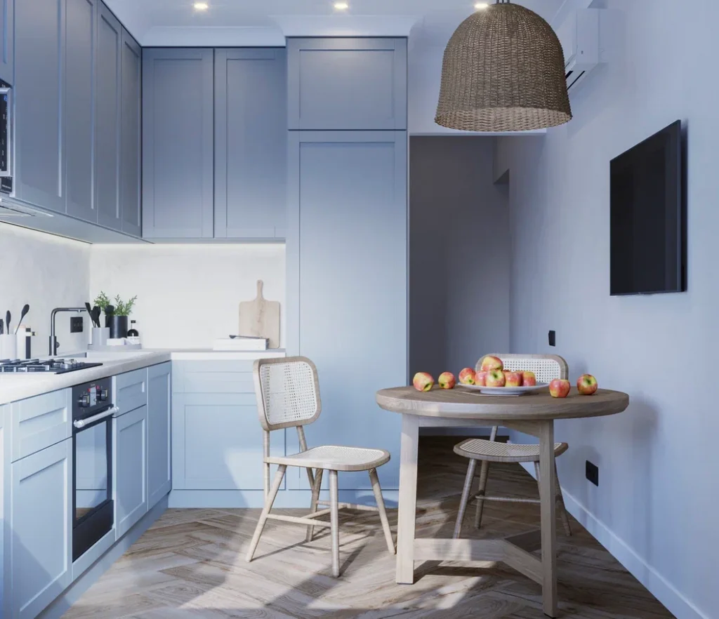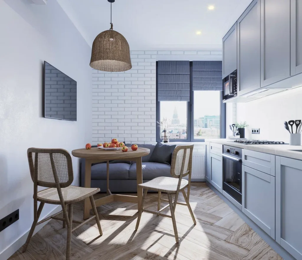 Достаточно холодная цветовая гамма кухни разбавлена деревянными покрытиями, мебелью и декором. На кухне присутствует ощущение чистоты и порядка за счет белого и холодно-серого цветов. Фасады кухонного гарнитура с рамкой, что смотрится уютно. Открывание происходит с помощью нажатия на фасад, что позволяет не захламлять вид мелкими элементами, как ручки. Вся кухонная бытовая техника встроенная, за счет чего кухня смотрится аккуратно и монолитно. В обеденной зоне уместился небольшой диван.