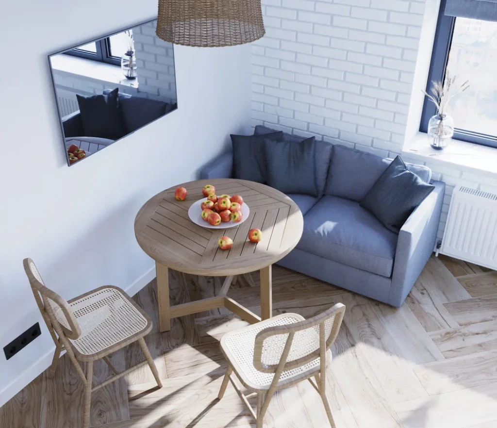 Двухкомнатная квартира для молодой девушки в эко-стиле с намёком на сканди, с прихожей, кухней, гостиной, лоджией, спальней, ванной и санузлом.