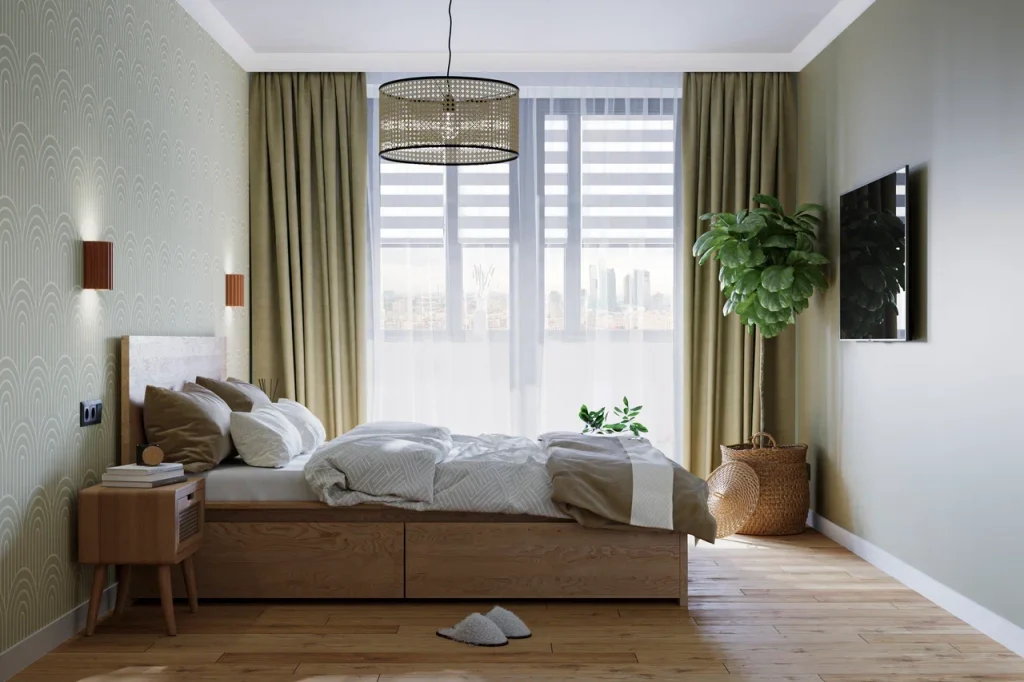 Оливковый цвет прокрался и в укромную спальню хозяйки. Выигрышно в таком сочетании смотрится деревянная мебель с плетенными вставками, а также подвесной светильник. Места хранения организованны не только в виде комода, но и в самой кровати – выдвижные ящики с обеих сторон. Этого достаточно, так как в квартире организована гардеробная комната.