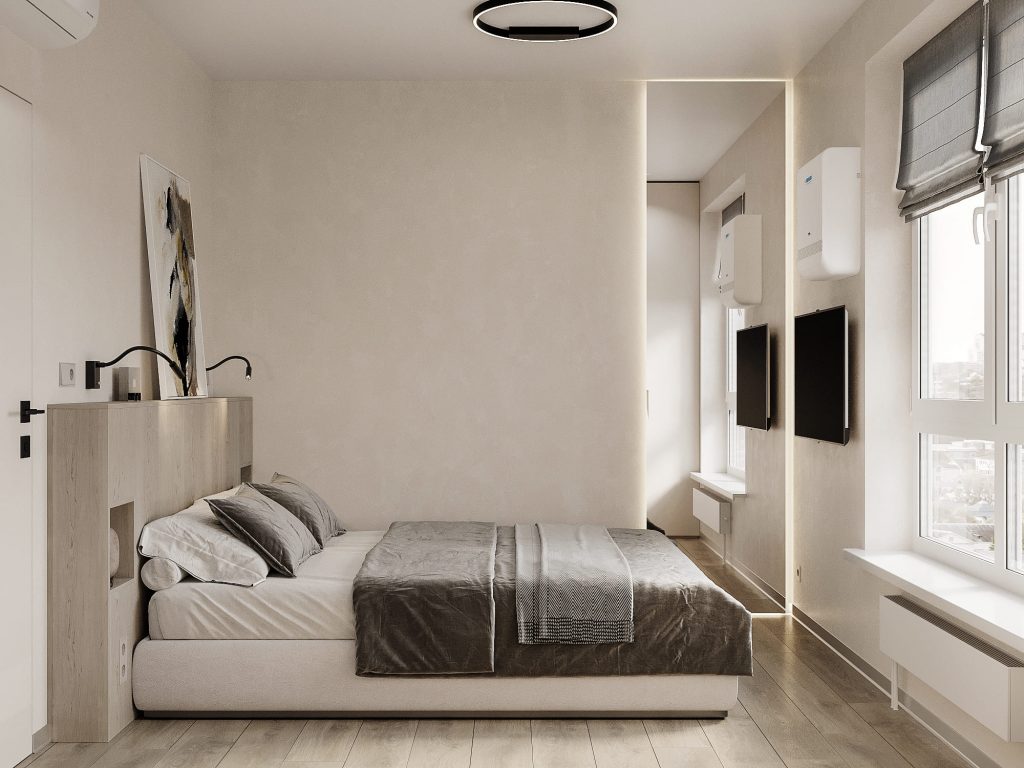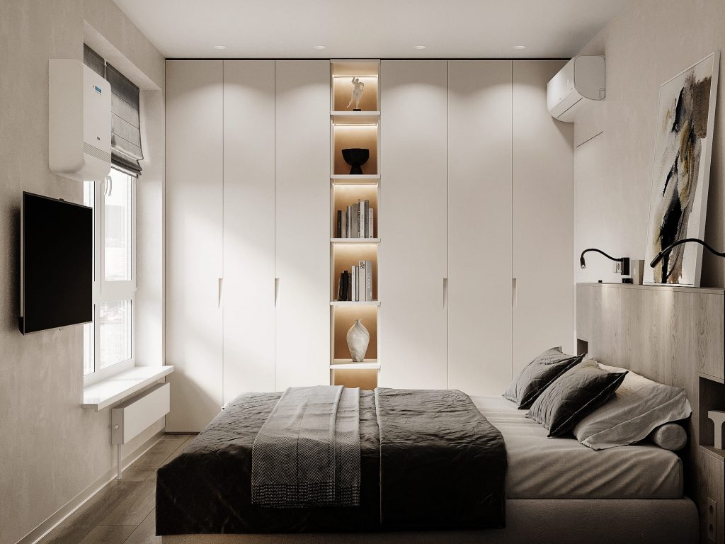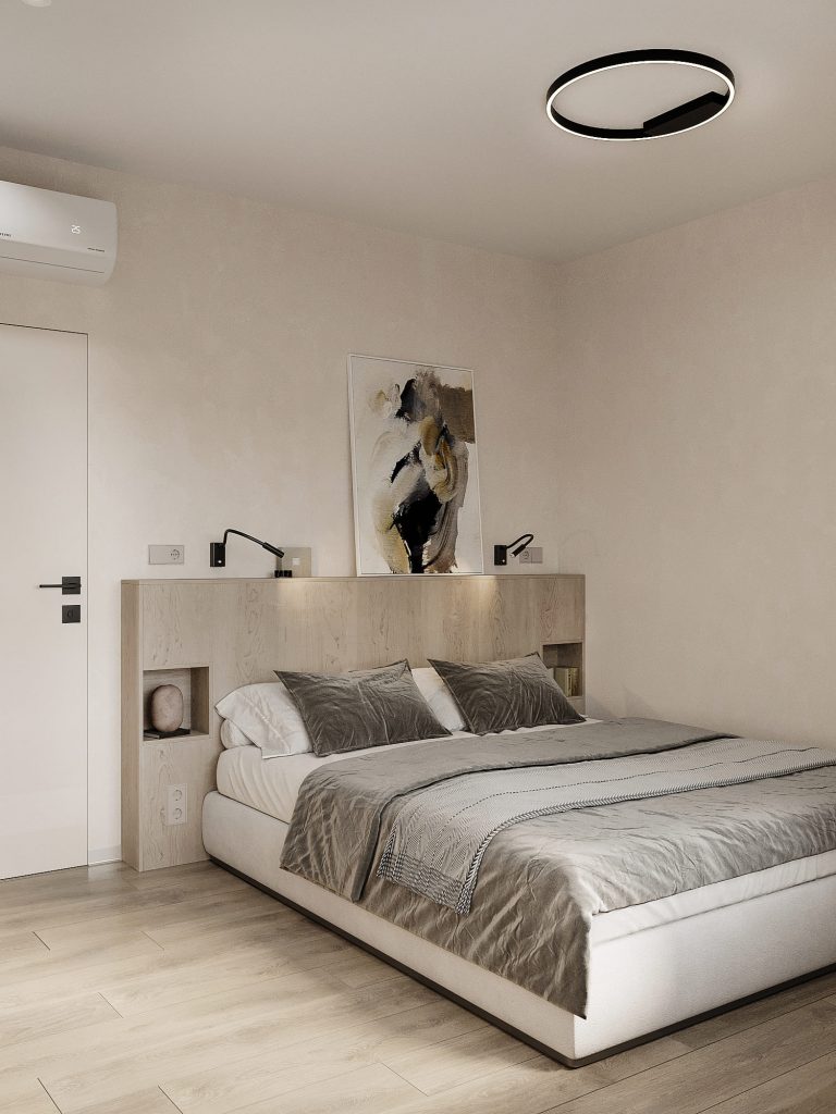 Спальня условно разделена на три функциональные зоны: сон, хранение и работа. Встроенные шкафы до потолка с гладкими фасадами и скрытыми ручками обеспечивают максимальное использование пространства. Зная, что хозяину нравится древесная текстура в мебели, мы спроектировали кровать с деревянным изголовьем, а интегрированные тумбы и мягкая подсветка создают комфортное место для отдыха. Матрас средней жесткости, установлен на оптимальной высоте, что способствует правильной поддержке позвоночника.