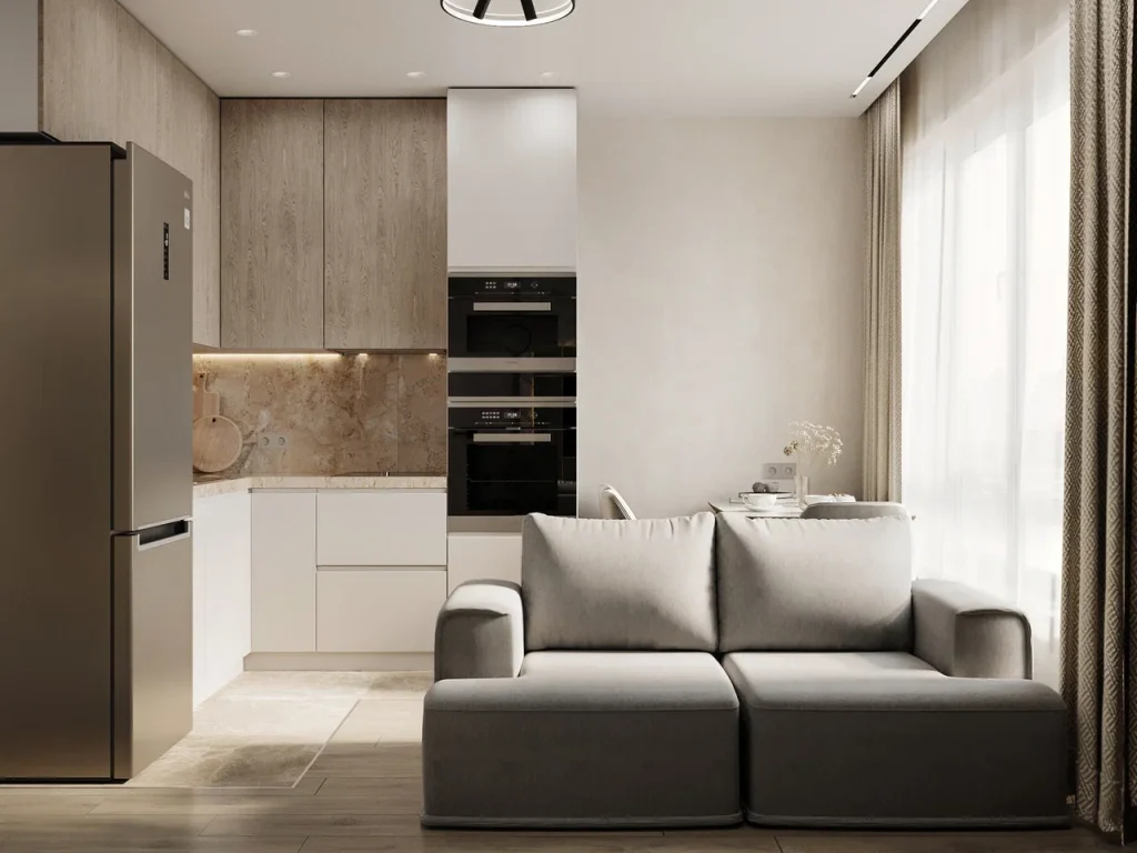 Двухкомнатная квартира для молодой пары в современном минималистичном стиле, в бежевых тонах, с кухней-гостиной, двумя спальнями и двумя санузлами.
