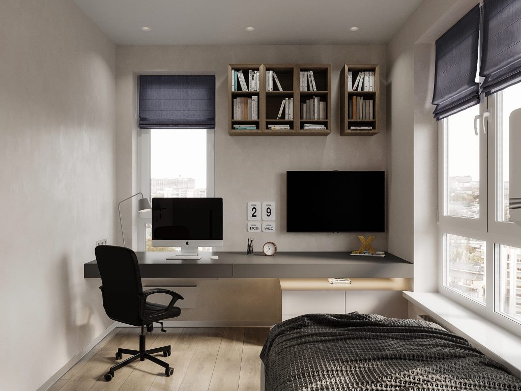 Римские шторы на окнах были выбраны для того, чтобы обеспечить регулируемую освещенность и приватность, что важно для концентрации и комфорта во время работы.