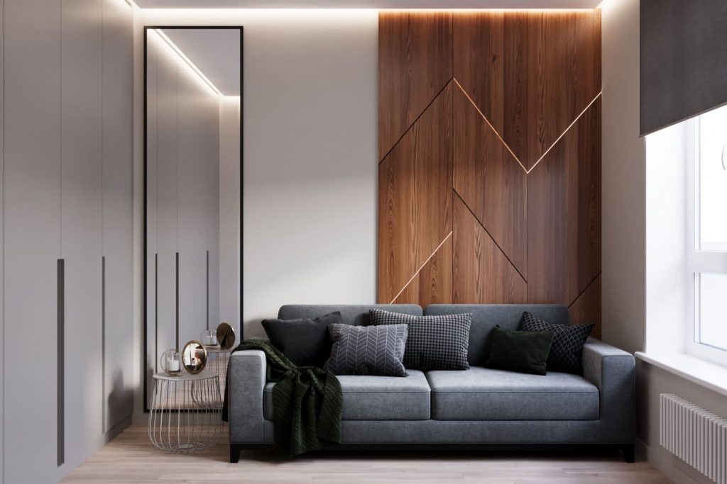 Серый диван у стены — не только зона отдыха, но и запасное спальное место для гостей. Стена за ним выделена декоративными деревянными панелями с графичной подсветкой — этот приём добавляет глубины и визуального ритма.