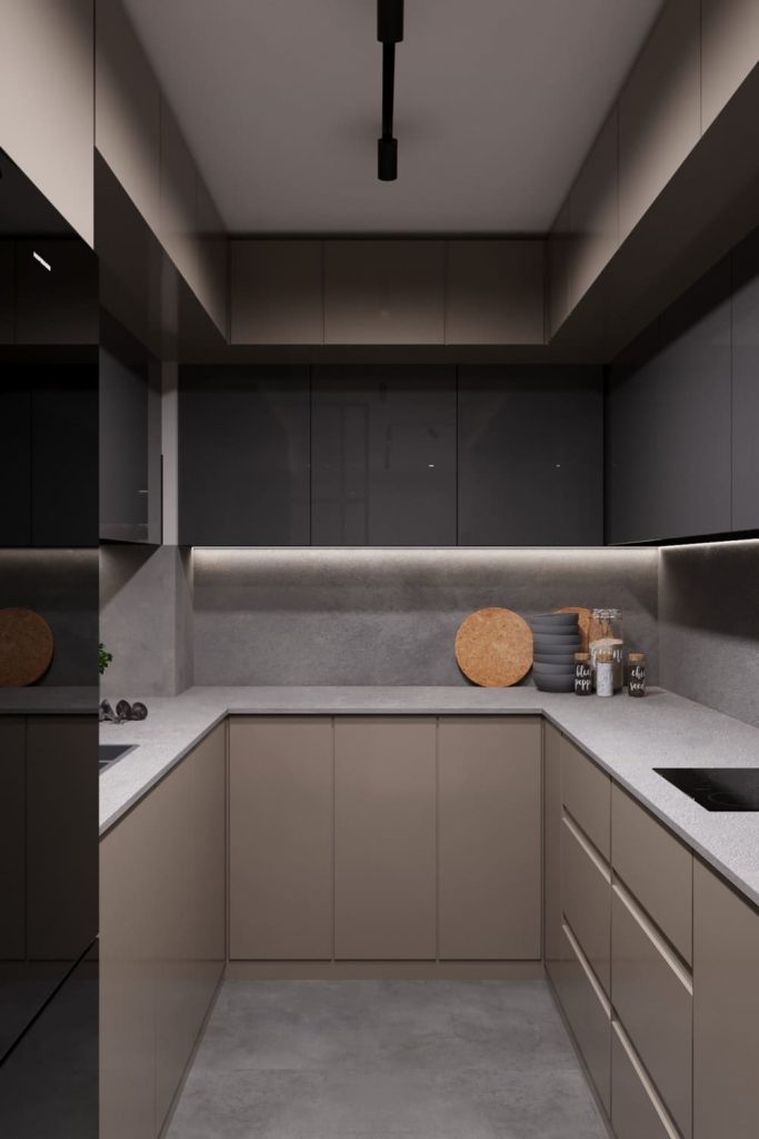 П-образная планировка даёт максимум рабочей поверхности и удобный доступ ко всем зонам. Мебель — с интегрированными ручками и доводчиками, техника встроенная. Всё под рукой — без визуального шума.