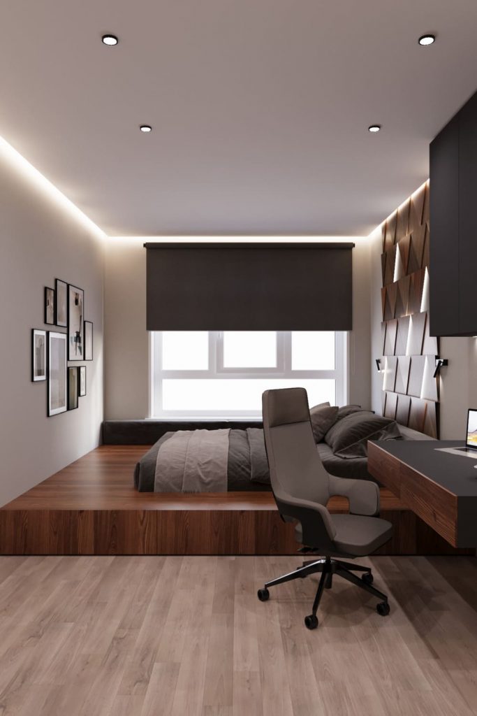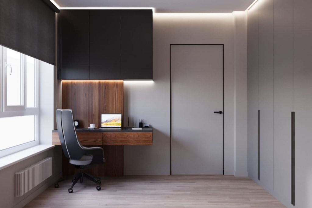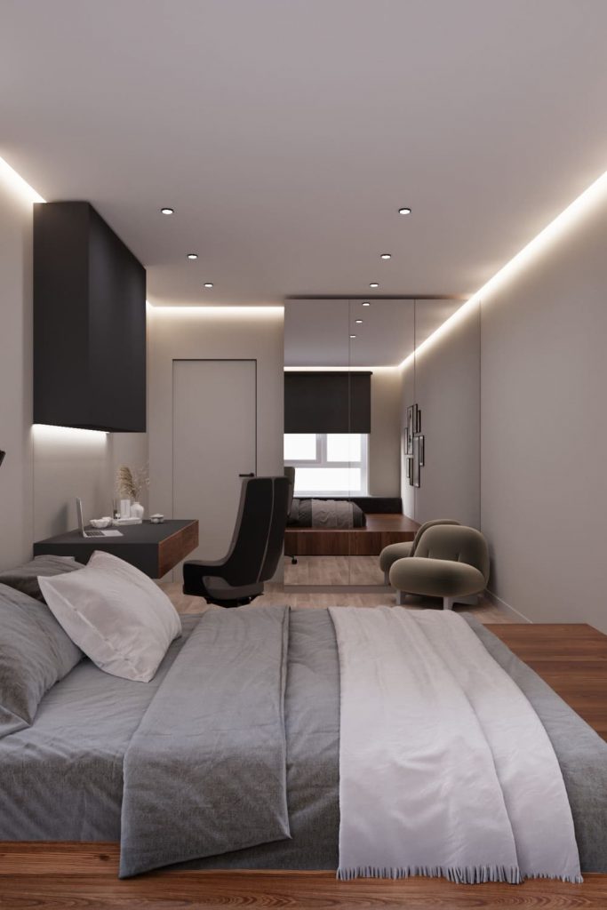 Рабочее место с лаконичным столом и подвесными шкафами вписано в пространство так, чтобы не перегружать его, но оставаться функциональным. Освещение — мягкое, с равномерной подсветкой по периметру потолка и локальными точками над зоной сна и работы.