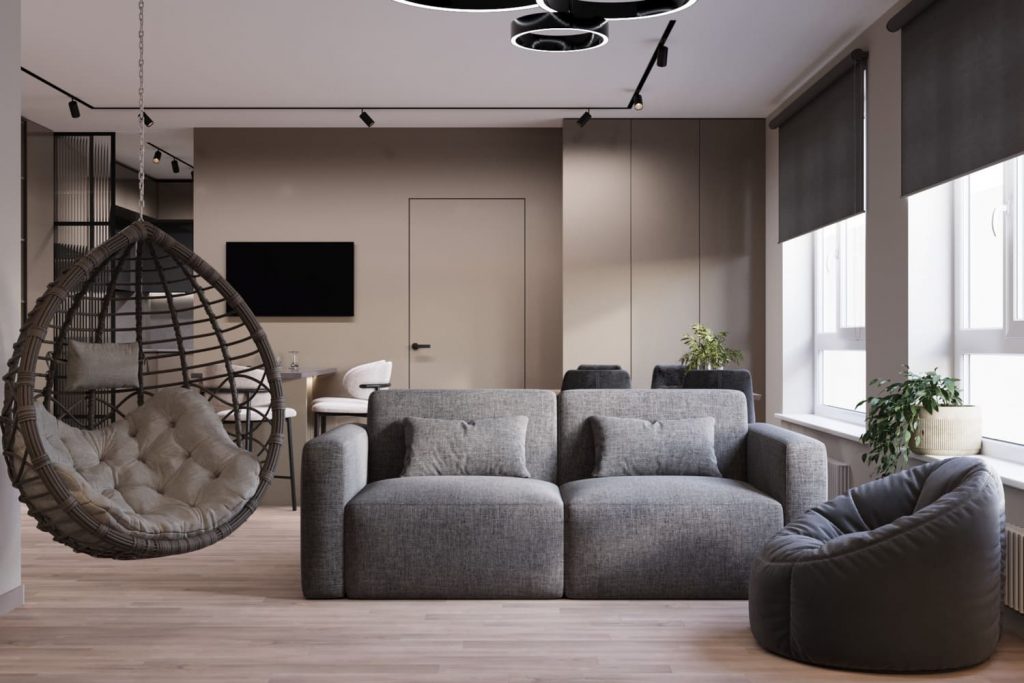 Медиа-зона оформлена в тёплом дереве и подсвечена встроенной подсветкой — получился уютный визуальный акцент на фоне спокойных стен. Светло-серый диван и подвесное кресло в углу добавляют уюта, не перегружая пространство.