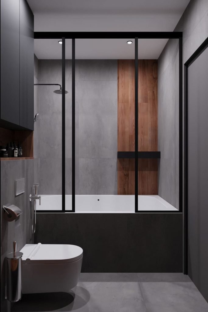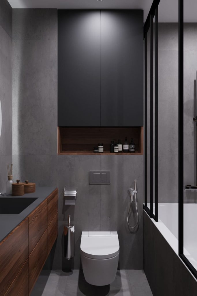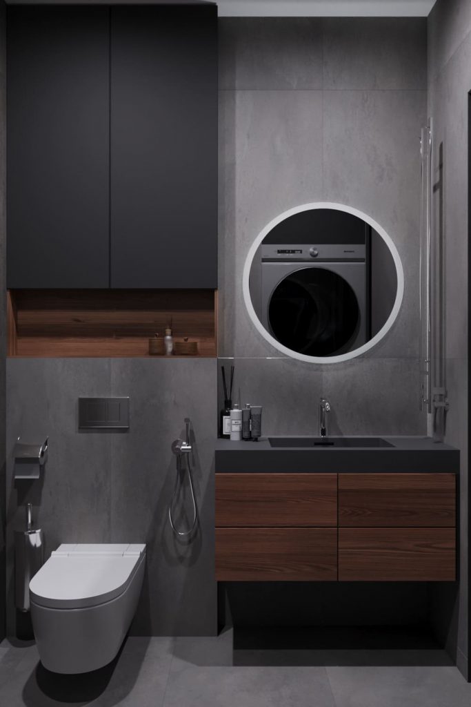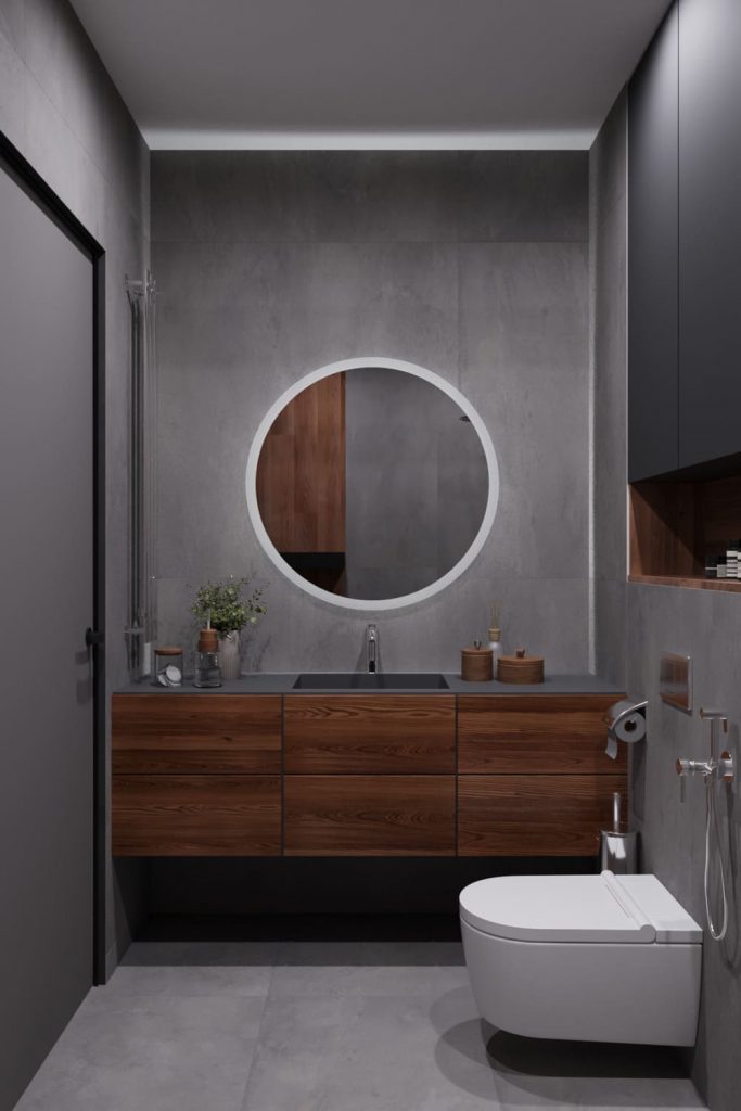 Ванная выполнена в том же минималистичном ключе, что и вся квартира. Основу составляют бетонные фактуры и тёплое дерево — сочетание строгости и уюта. Подвесная тумба с деревянными фасадами задаёт тон всему пространству. Над ней — круглое зеркало с подсветкой, визуально расширяющее комнату. Зона ванны отделена матовыми стеклянными перегородками с чёрным профилем — аккуратный акцент, подчёркивающий геометрию. Скрытое хранение, встроенные ниши и лаконичные формы делают ванную не только стильной, но и удобной в повседневном использовании.