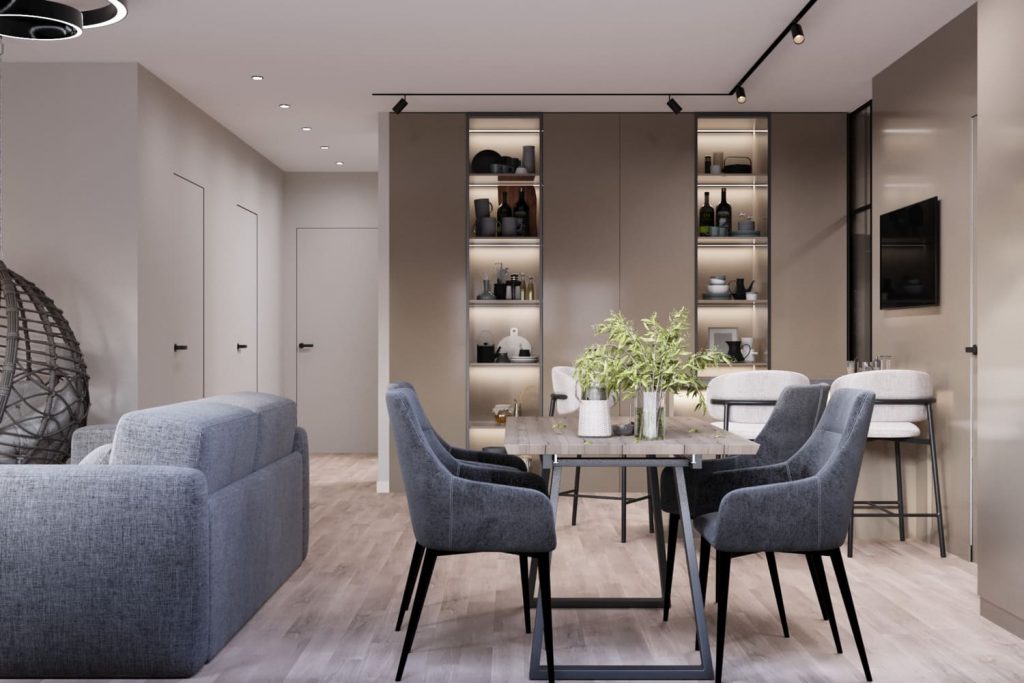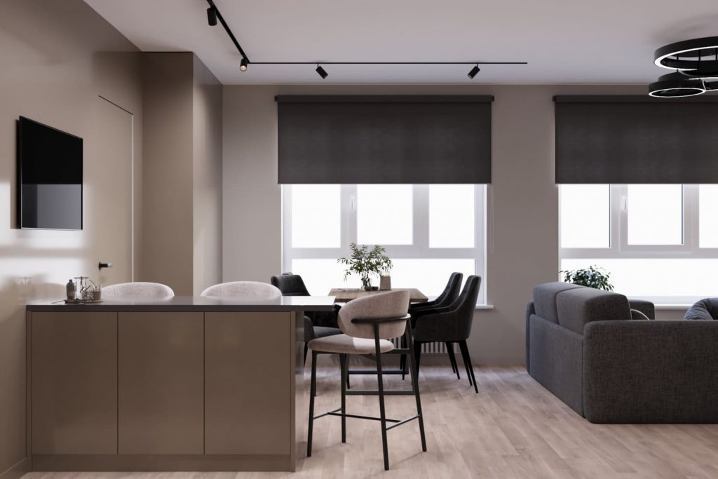 Большой обеденный стол легко собирает компанию из шести человек, а мягкие кресла обеспечивают удобство даже при долгих посиделках. Рядом — барная зона с высокими стульями и встроенным ТВ, чтобы всё было под рукой.