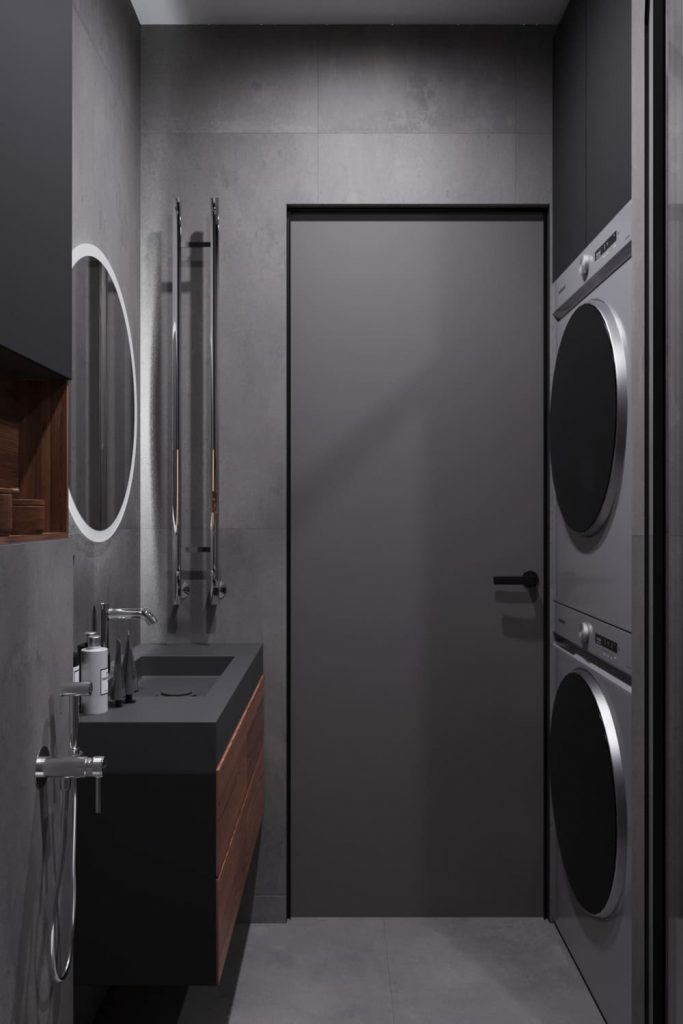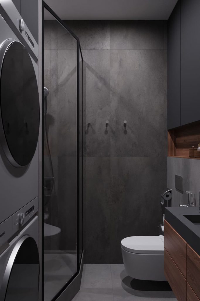 Второй санузел мы сделали компактным, но функциональным. Здесь поместилась полноценная душевая кабина с чёрным профилем, подвесной унитаз и тумба с раковиной. Отдельно выделили зону хранения — шкаф над инсталляцией и ящики под раковиной. Встроенная ниша добавляет удобства для хранения косметики. Стиральная и сушильная машины встроены в нишу у входа и закрыты верхним шкафом, чтобы не перегружать интерьер. Графитовые фасады, бетон и дерево — всё тот же минимализм, только в практичном, функциональном исполнении.
