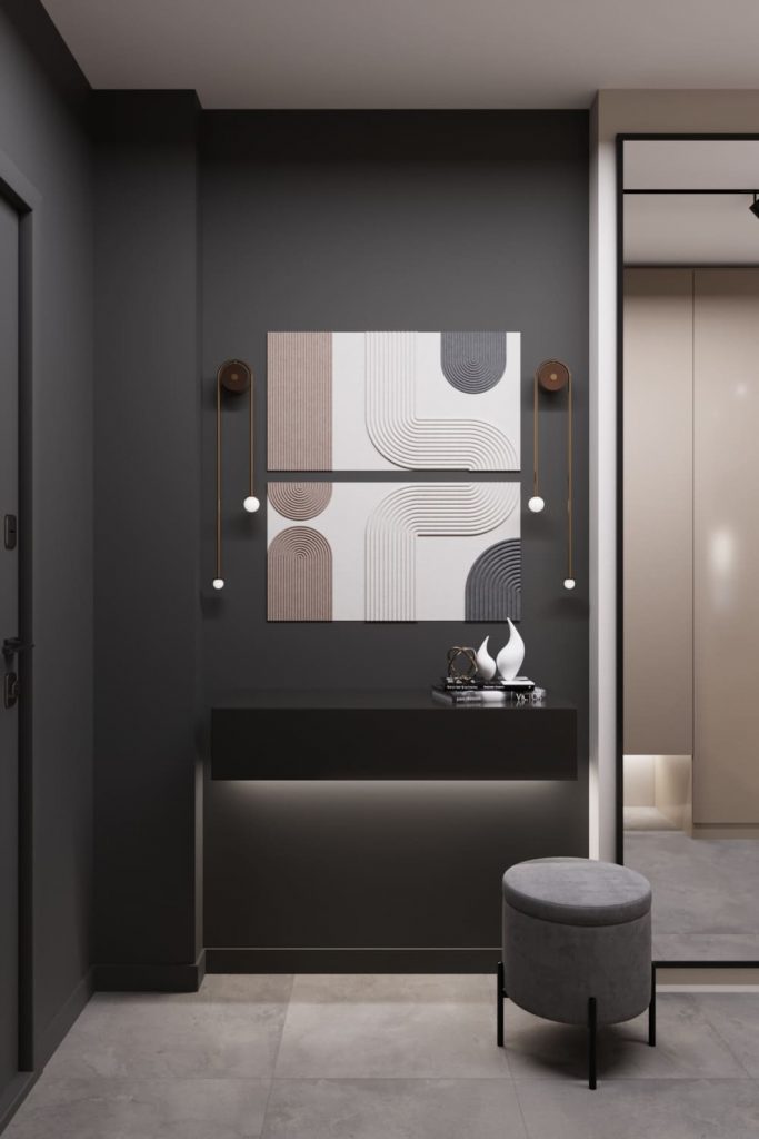 Справа — графитовая консоль с подсветкой и мягкий пуф для удобства. Над консолью — декоративные панно и подвесные светильники, задающие атмосферу.