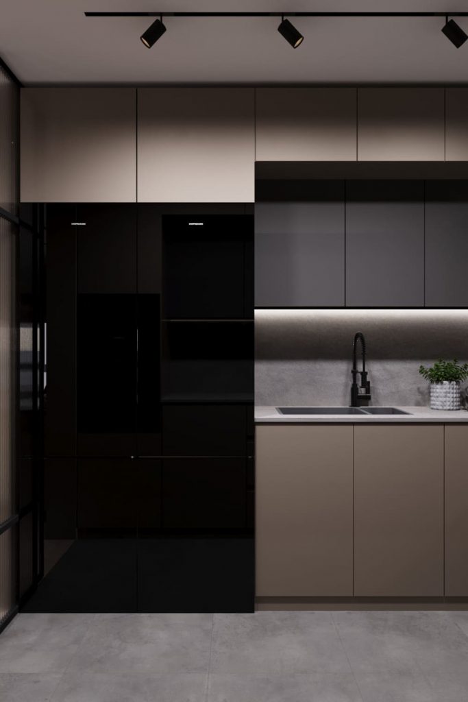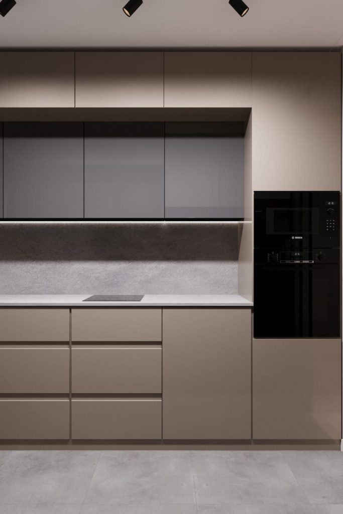 По просьбе заказчиков кухня в этом проекте — изолированная, но полностью интегрированная в общий стиль квартиры. Цветовая гамма — спокойная, монохромная: серо-бежевые фасады сочетаются с графитовыми модулями и бетонной текстурой фартука.