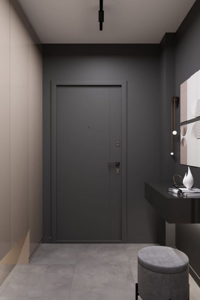 Прихожая оформлена в монохромной гамме: графитовые стены, светлые фасады, строгие линии — всё подчинено чистоте форм.