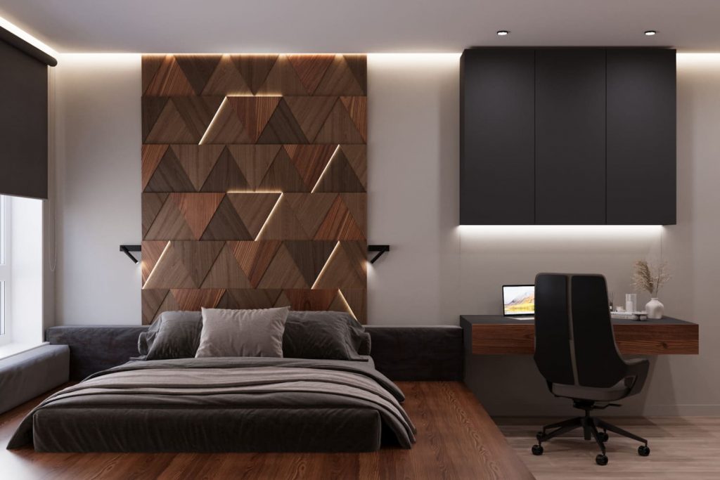 Центральный акцент — стена за кроватью, оформленная 3D-панелями из дерева с подсветкой. Тёплая геометрия делает интерьер динамичным, но не выбивается из общей минималистичной концепции.