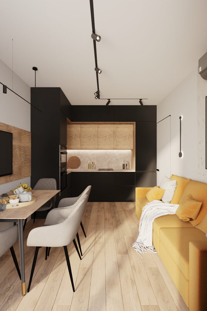 Кухня в дизайн-проекте наполнена теплом. Этот эффект достигается сочетанием текстуры дерева (в напольном покрытии, фасадах кухни, деревянной панели в зоне ТВ) и яркого желтого дивана. Мы решили добавить немного лофта в пространство с помощью смелых темных акцентов и элементов отделки стен. Так, практически повсеместно черные фасады кухни выглядят лаконично и цельно, не утяжеляя пространство. Им вторят детали: встроенная система трековых светильников, бра, дизайнерская люстра над столом и абстракция на стене возле дивана.