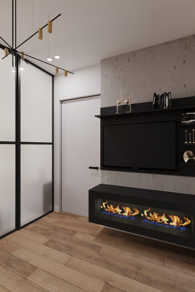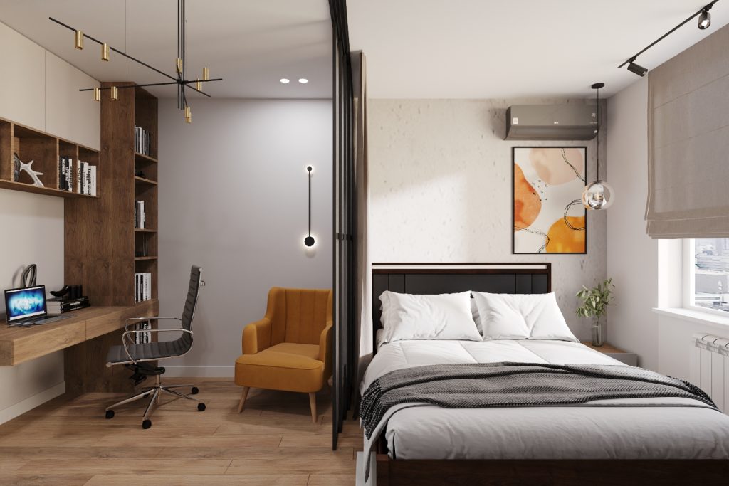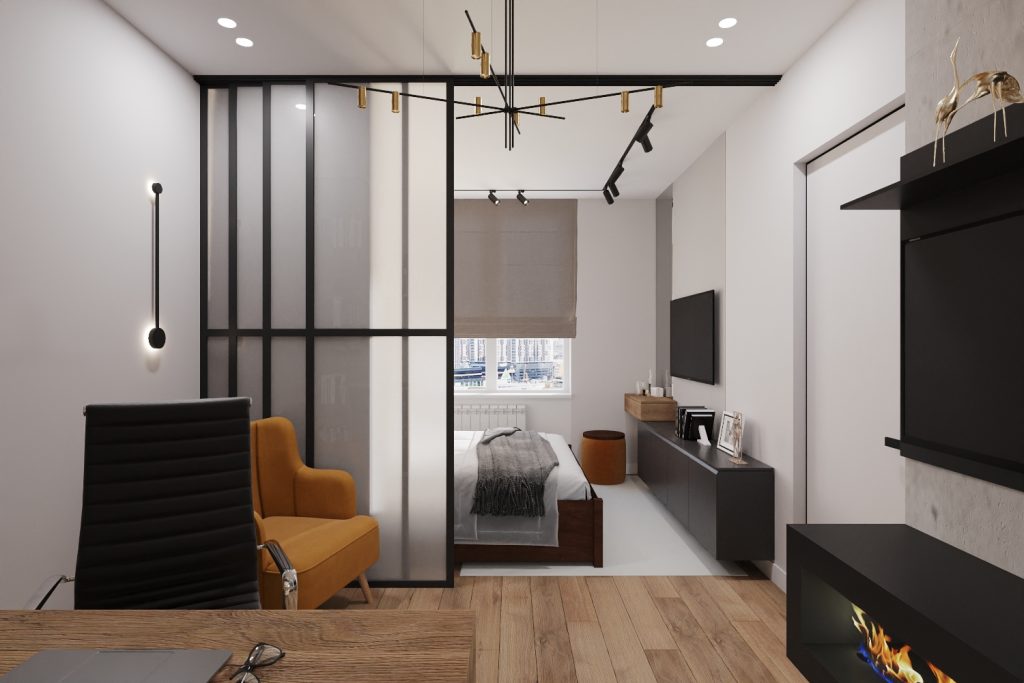 Вторая комната разделена перегородкой на два основных пространства: кабинет и непосредственно спальню. Говоря о первой части, рабочей зоне, стоит отметить просторный консольный стол с креслом, оборудованный большим количеством мест хранения: закрытые и открытые полки, выдвижные ящики, стеллаж справа от стола. А также мы решили разместить здесь уютное желтое кресло неподалеку от электрического камина и ТВ — импровизированная зона отдыха.
