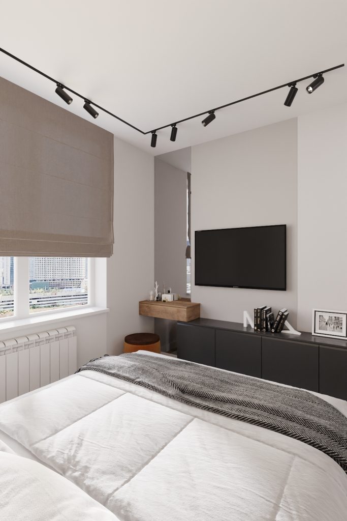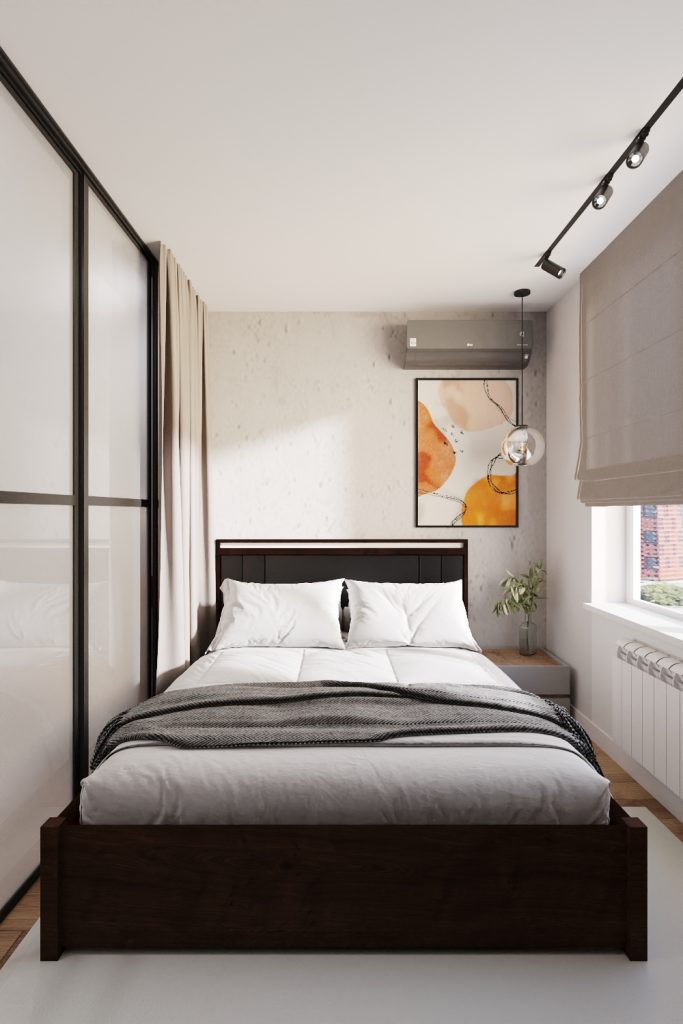 Саму спальню, выслушав все пожелания заказчицы, мы сделали светлой и легкой: с большой двуспальной кроватью, консольным туалетным столиком с большим зеркалом. А также с вместительной тумбой под ТВ — она вторит темному корпусу кровати, создавая легкую динамику минималистичного эргономичного пространства. Терракотовый пуф здесь становится своеобразной доминантной в цветовой композиции спальни, наряду с абстрактной картиной.