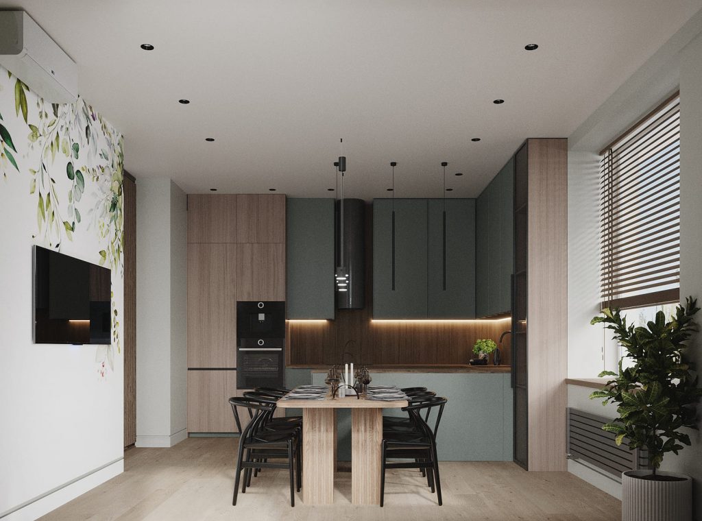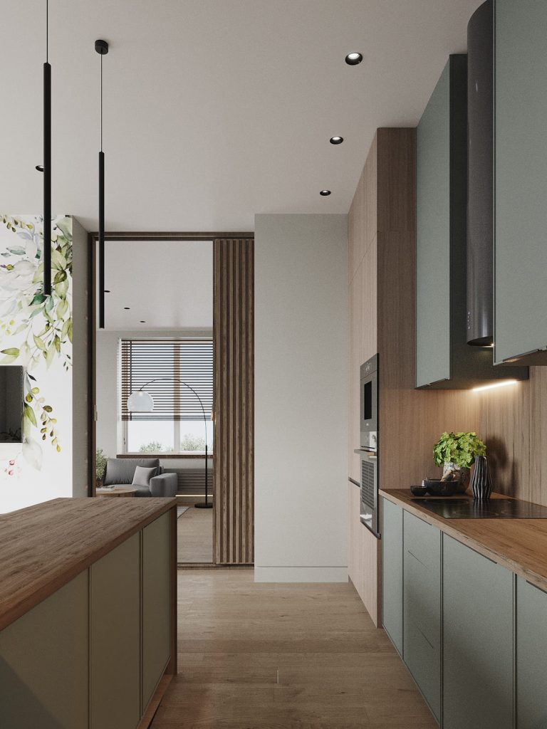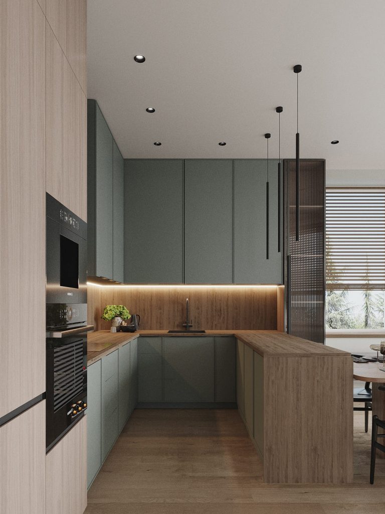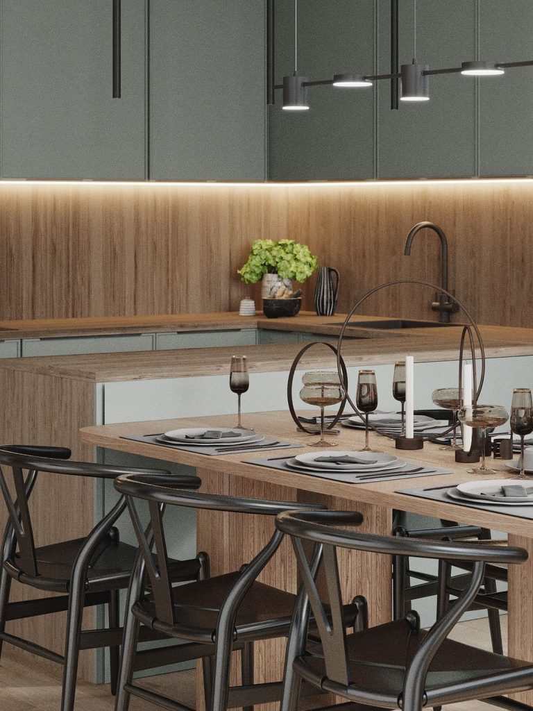Фасады кухонного гарнитура выполнены в приглушённом зелёном оттенке, который отлично сочетается с древесными поверхностями. Тёплая подсветка подчёркивает текстуру дерева и создаёт уютный вечерний свет. Рабочая зона удобно организована по периметру, а остров с деревянной столешницей плавно переходит в обеденный стол — решение, которое объединяет кухню и столовую в единое пространство для общения и приёма гостей.
