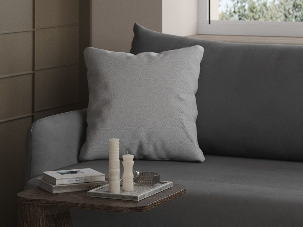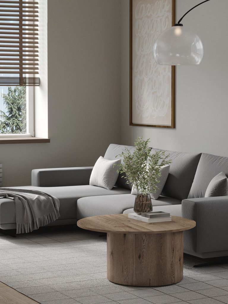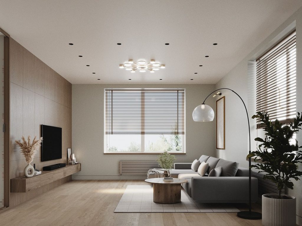 Лёгкий серый диван и кресла образуют комфортную зону для общения, чтения или просмотра фильмов. Нейтральная палитра оттенков дополнена тёплыми акцентами: деревянный журнальный столик, настенные панели и элементы декора создают мягкий контраст.
