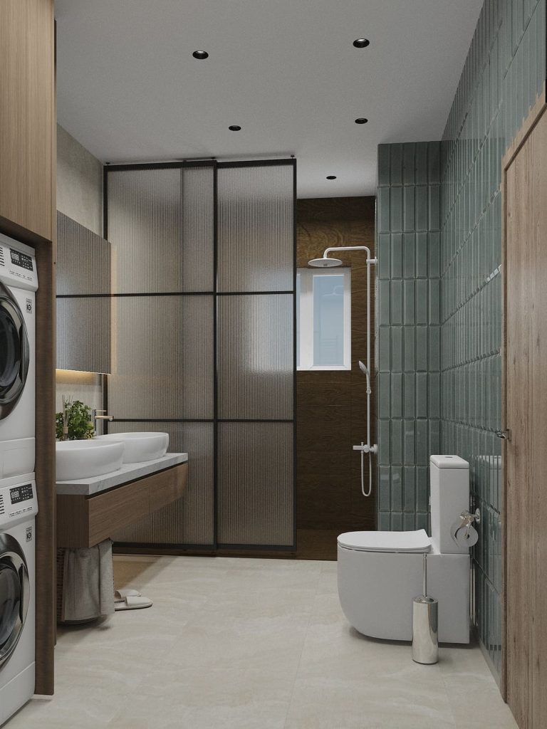Особое внимание уделено практичности — в комнате размещены стиральная и сушильная машины, встроенные в единую композицию мебели. Тёплый оттенок дерева и мягкий свет подсветки уравновешивают прохладные тона плитки, создавая уют и гармонию.