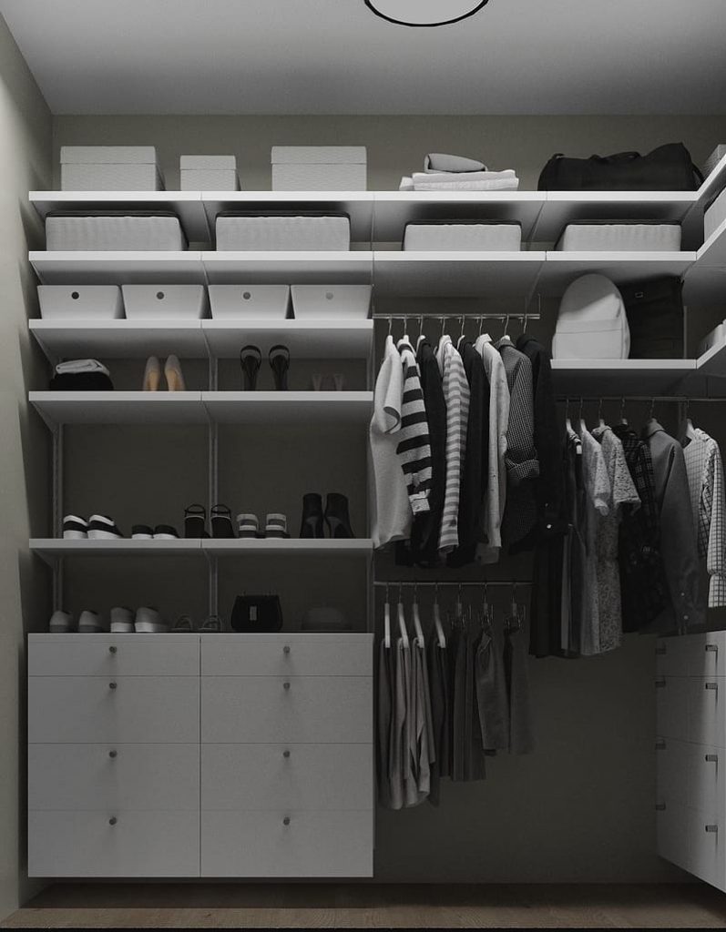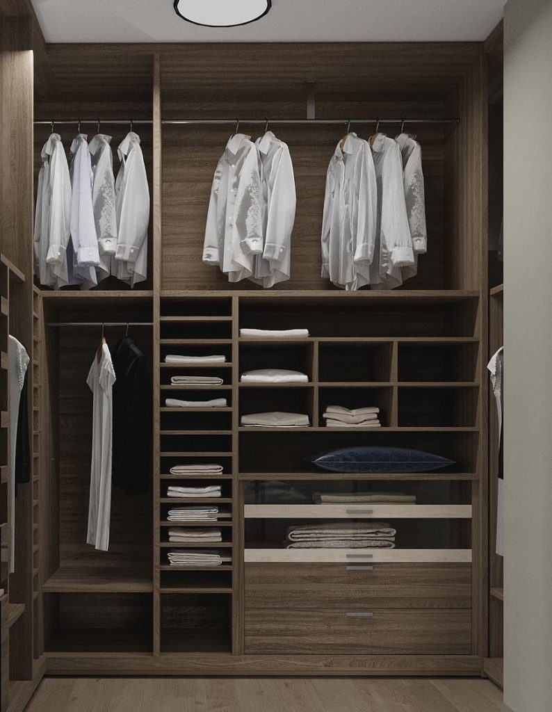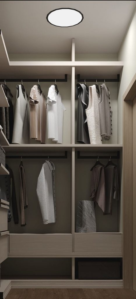 Гардеробная зона решает вопрос хранения вещей — всё разложено по секциям и закрытым ящикам, что сохраняет порядок и визуальную лёгкость комнаты.