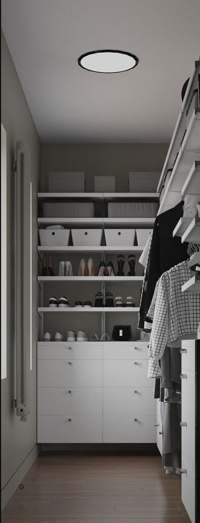 Гардеробная в этом коттедже выполнена в лаконичном современном стиле и сочетает практичность с эстетикой. Система хранения организована так, чтобы удобно разместить одежду, обувь и аксессуары: предусмотрены открытые полки для чемоданов и коробок, выдвижные ящики для мелких вещей, секции с перекладинами для длинной и короткой одежды. Светлые фасады визуально расширяют пространство, а продуманная подсветка делает его уютным и удобным в использовании.